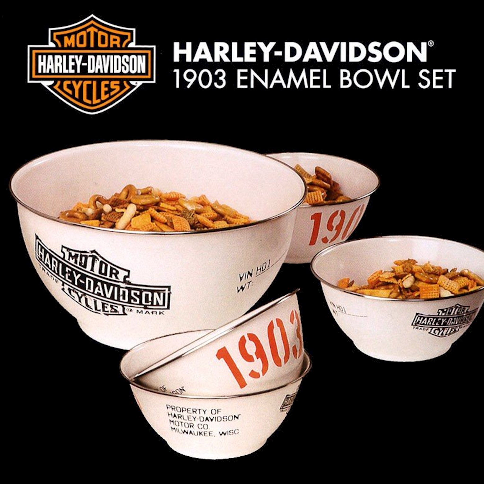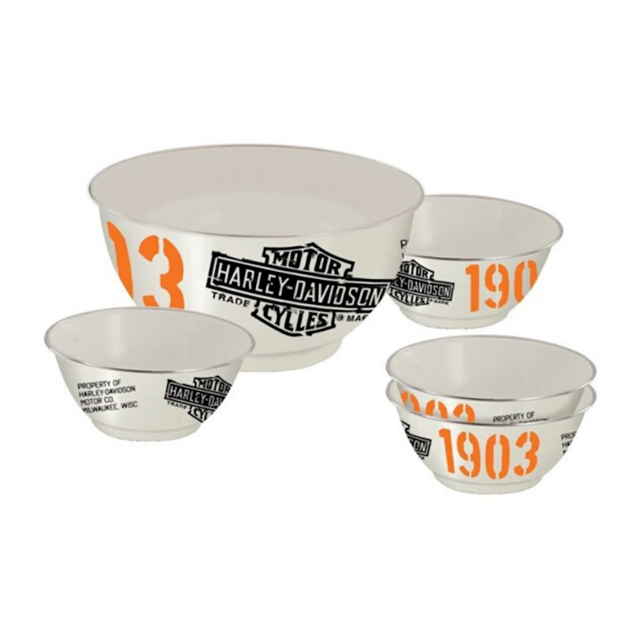 Harley-Davidson 1903 Emaille Snack Bowl Set, serves up snacks in style. Set includes large 5 Qt. serving bowl and four 24 oz. Snack bowls that are perfect for popcorn or chips. Durable enamel coated steel bowls with the H-D 1903 graphic look great in any setting.