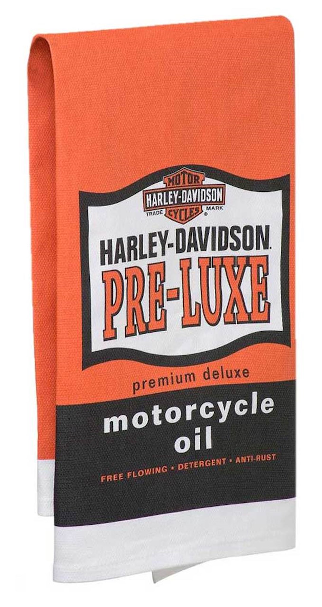 Harley-Davidson® Pre-Luxe Bar Towel, HDL. Add flair to your bar with the vibrant colors of the H-D™ Pre-Luxe Bar Towel. Generously sized, 22" W x 32" L. Made from 100% absorbent cotton pique towel with sewn in cotton corner loop for hanging is individually silk-screened with organic pigments. Machine wash warm, tumble dry low. Do not bleach. Black, Orange & White.