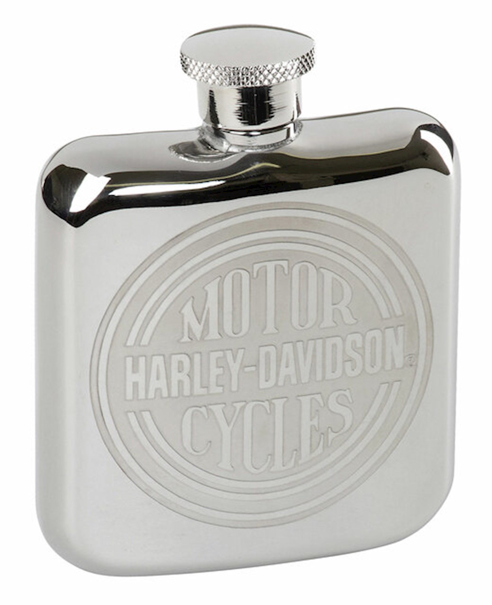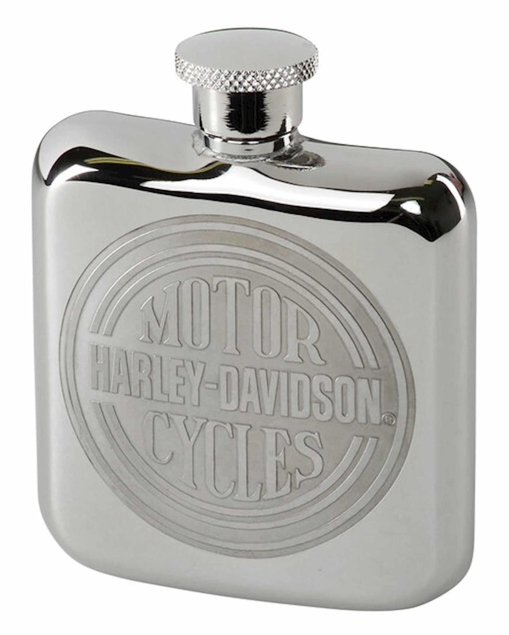 Harley-Davidson® Circle Logo Flask, HDL-18596. Size: 4 oz. Stainless steel construction. Features engraved Harley-Davidson® Circle logo on front. Hand wash only. Do not microwave. Dimensions: 4.5" H x 4" W x 0.86" D.