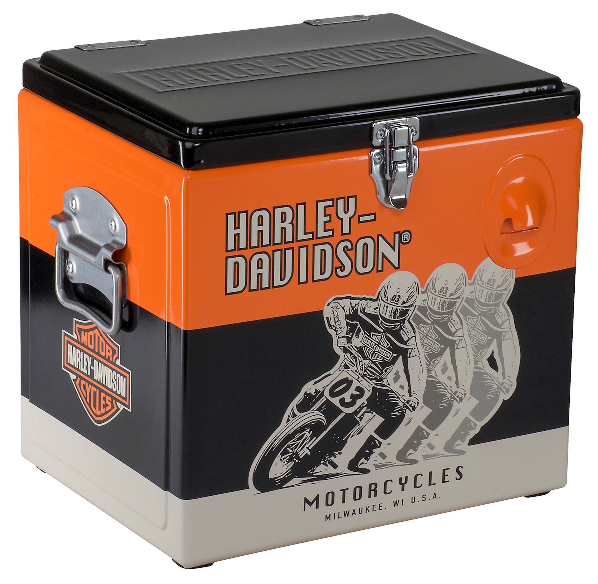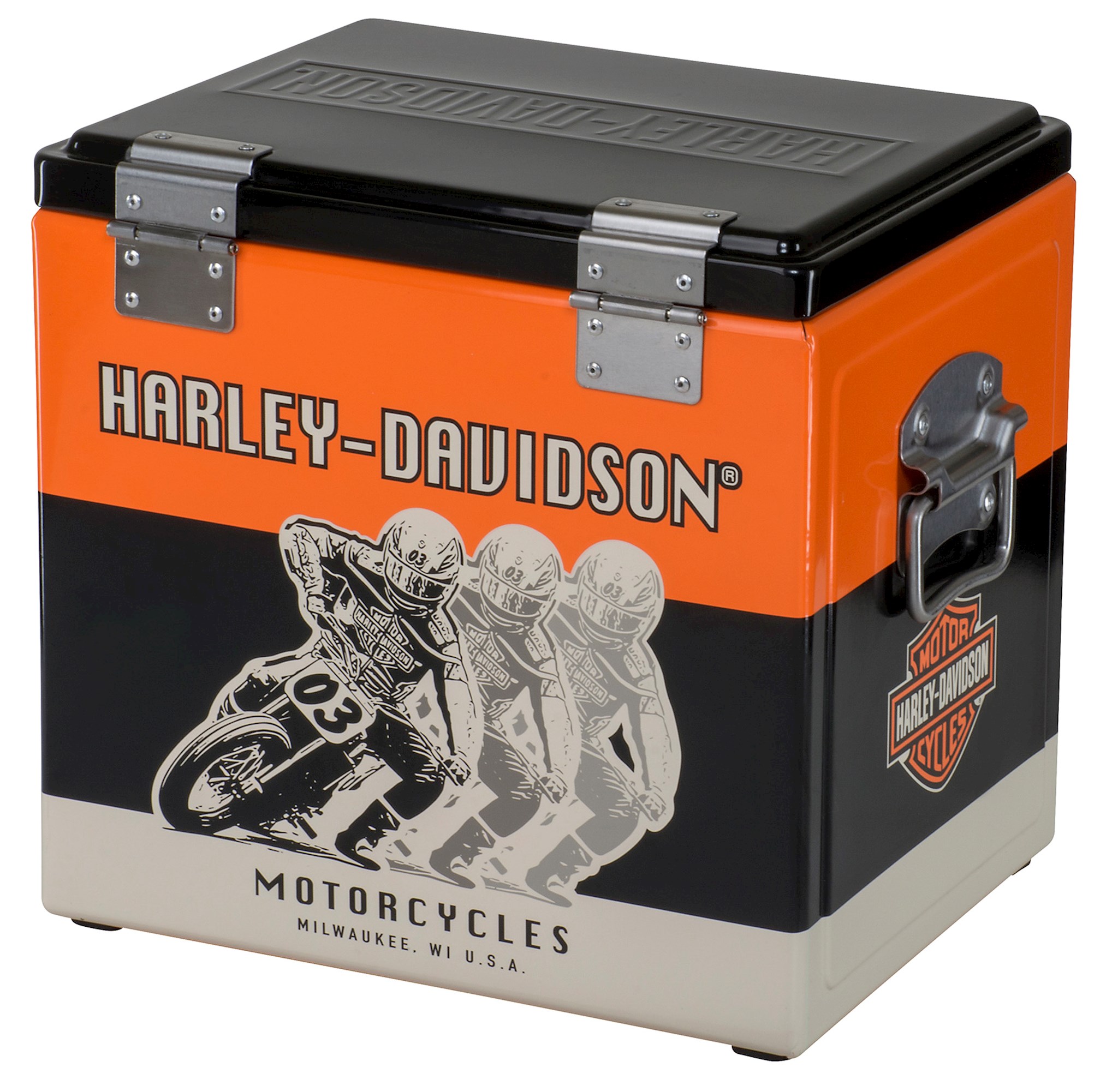 15 Liter metal cooler features H-D Racing graphics and embossed Harley-Davidson on the lid. Built-in bottle opener included. Dimensions: 12.5" L x 10" D x 12" H / 32 x 25 x 31 cm