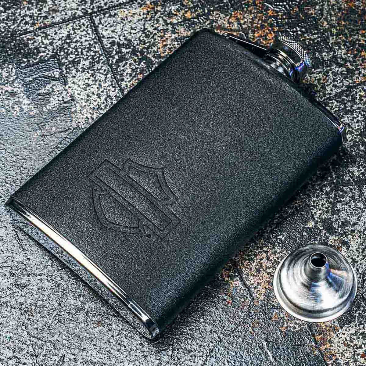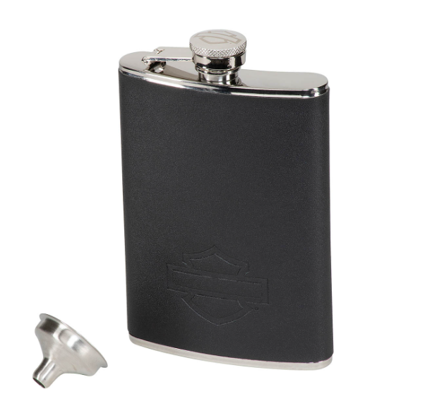 Rugged, stainless steel, 8 oz. / 240 ml black leatherette wrap features an embossed Open Bar & Shield logo. Easy fill stainless steel funnel included. Flask Dimensions: 3.75” W x 6” H x 1” D / 9.5 x 15 x 2.5 cm.