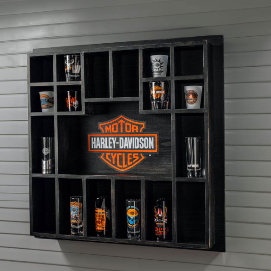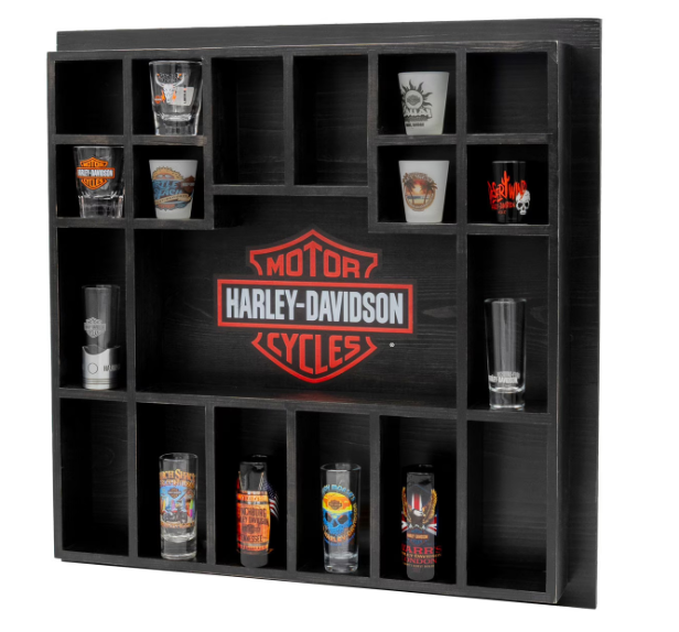 Solid wood display case with black finish and Bar & Shield logo. Holds eighteen shot glasses. Ten standard and ten tall. Dimensions: 23.5” W x 23.5” H x 3” D 60 x 60 x 8 cm.
