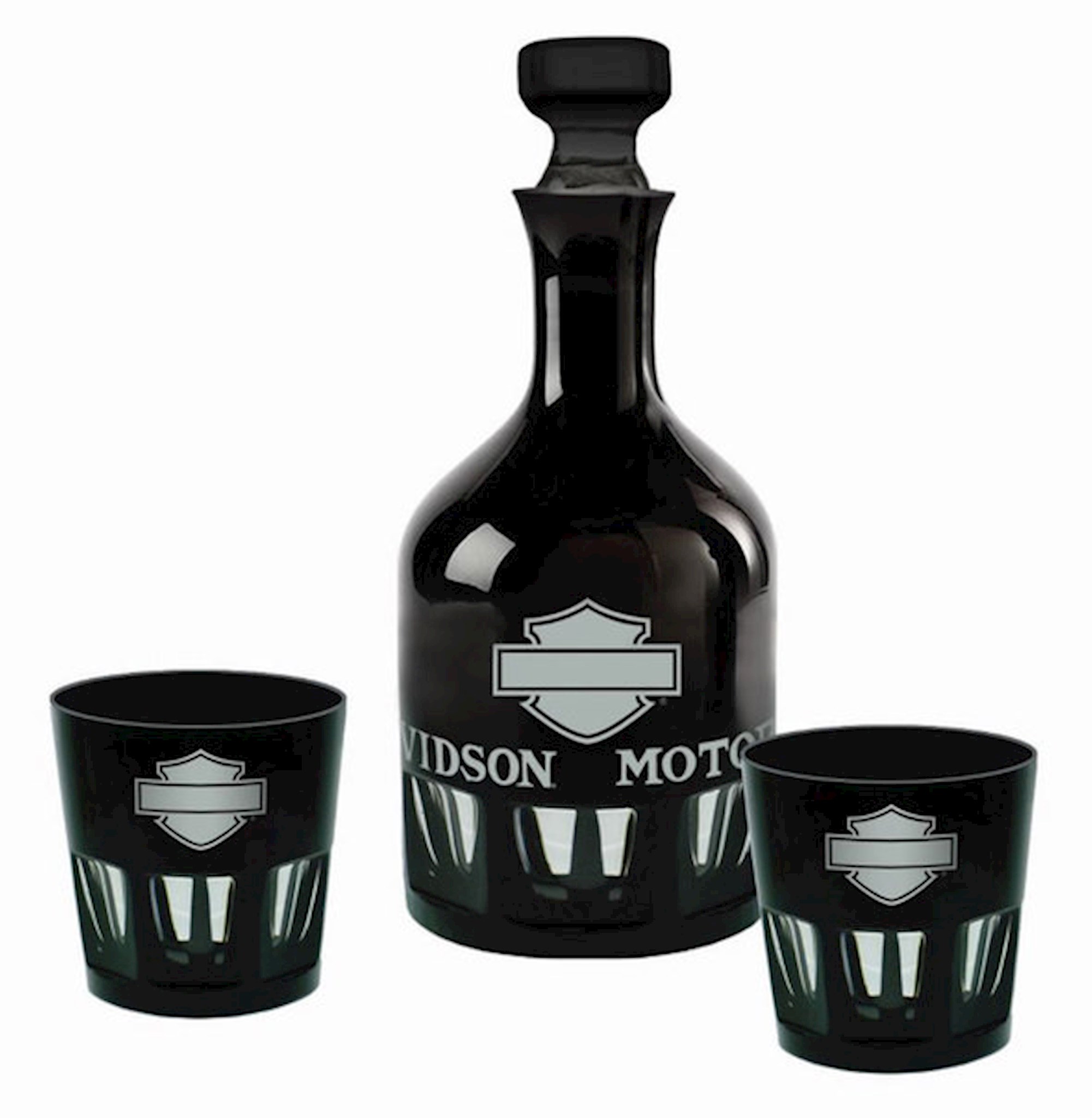 Harley-Davidson® Silhouette Bar & Shield Decanter Set, HDL-18765. If you are as serious about your spirits as you are your motorcycle – then this Silhouette Bar & Shield Decanter Set is definitely for you! Stunning 850 ml decanter with glass stopper and set of two 12 oz. tumblers are hand blown from double-layered clear and midnight black glass. Hand cut accents and etched logos add a sophisticated touch of class to this impressive set. Decanter is hand wash only. Decanter Dimensions: 9" H x 4.5" diameter.