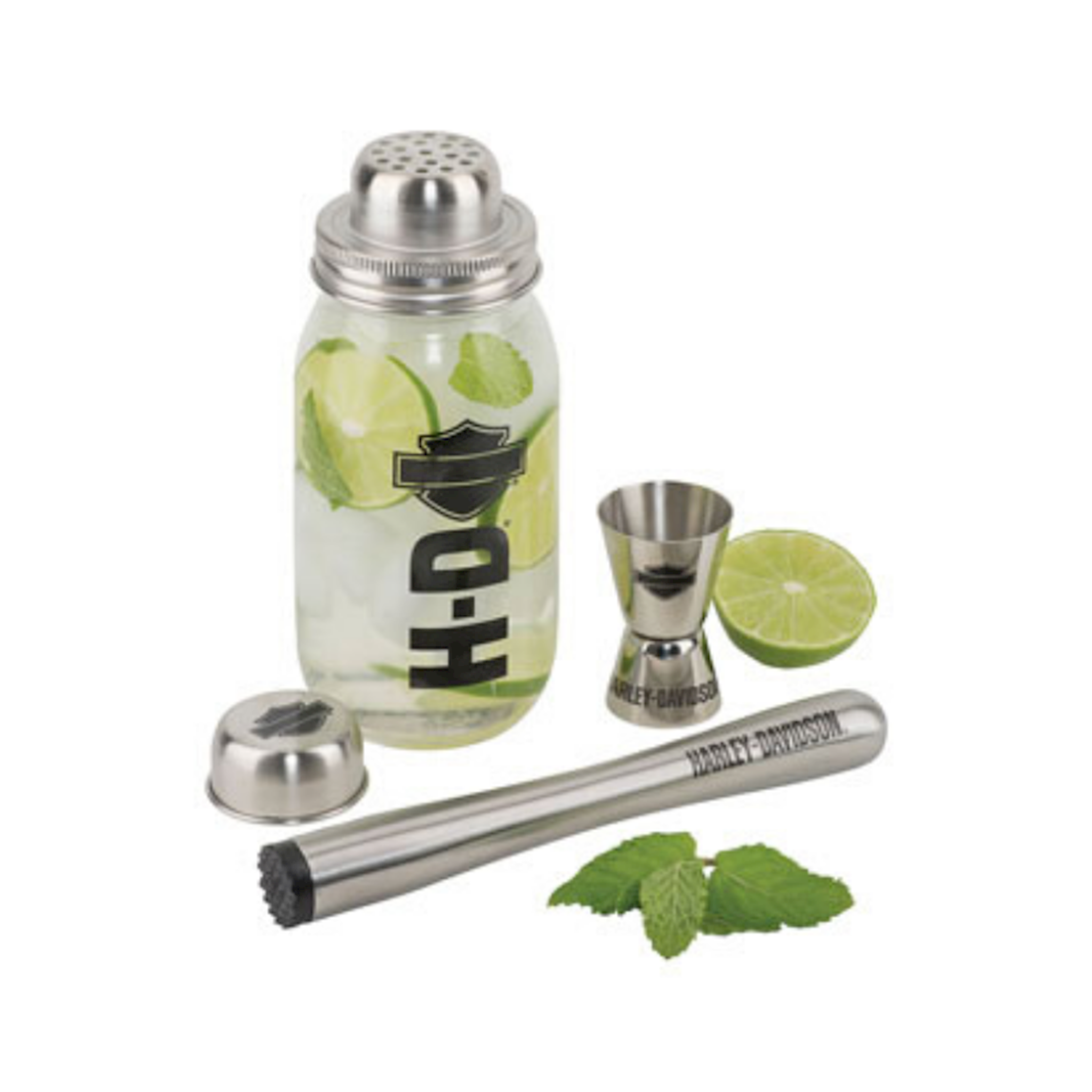 You're not the beer & a shot drinker you used to be. These days, you require a little more. Mix it up with the H-D® Stainless Steel cocktail Shaker Set. Create a beverage that's a bit more complex, but easy to prepare with the shaker set that includes all the right accessories. From the glass shaker with strainer lid (a must) to the stainless steel jigger (of course) and the stainless steel muddler (yes, we thought of everything) -- this set lets your thirsty mixology skills shine. Each piece features the Bar & Shield® silhouette graphic and/or the H-D® signature branding that makes it, officially, a party-starter. After a long ride or a rigorous work week, nothing satisfies like a little down time with your fellow riders, the top-shelf beverage of your choice and a blend of tonic, citrus and fresh herbs. You can almost taste it. Strainer holds approximately 24 fluid ounces. Glass/Stainless Steel.