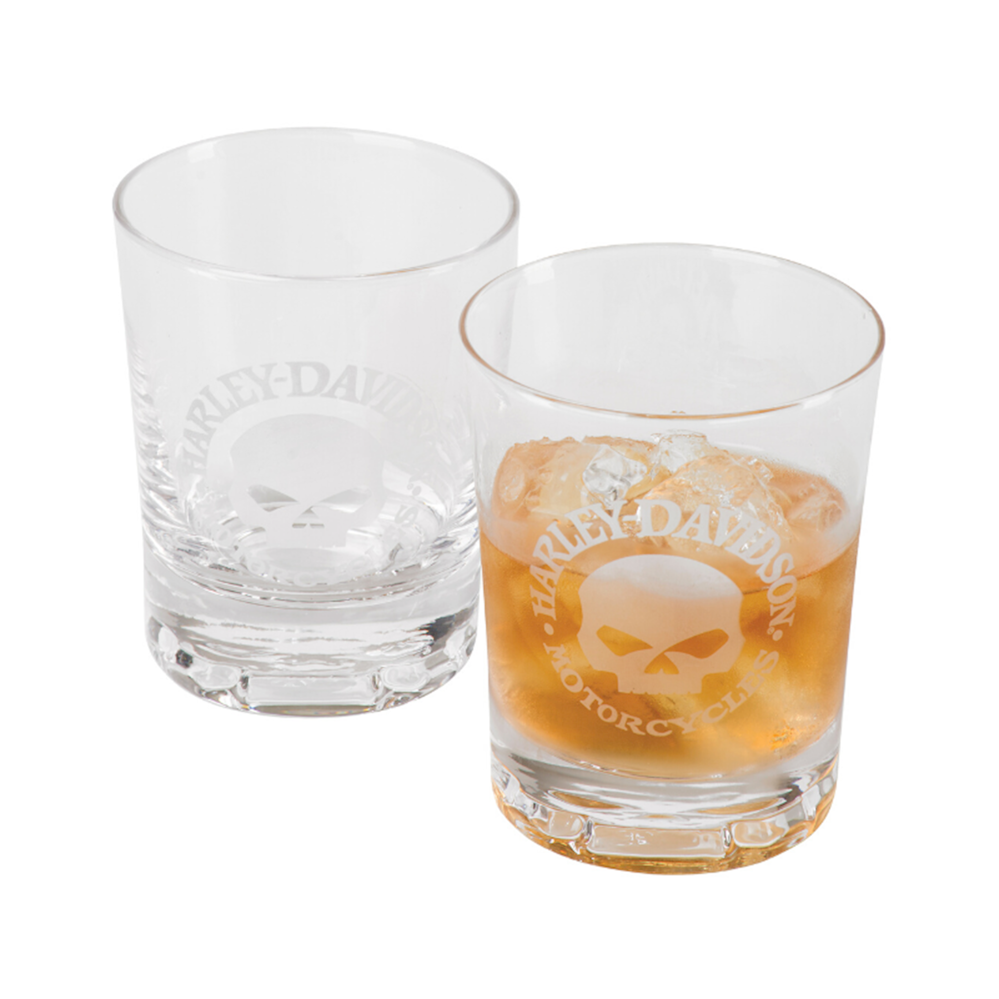 Set van twee 300 ml. glazen met matte Willie G Skull-logo's. Speciaal bewerkt doodshoofdlogo in glazen voet. De perfecte aanvulling in uw thuisbar! Set van twee Grootte: 300 ml. Frosted Willie G Skull-logo's Speciaal bewerkt doodshoofdlogo in glazen voet De perfecte aanvulling op uw thuisbar!