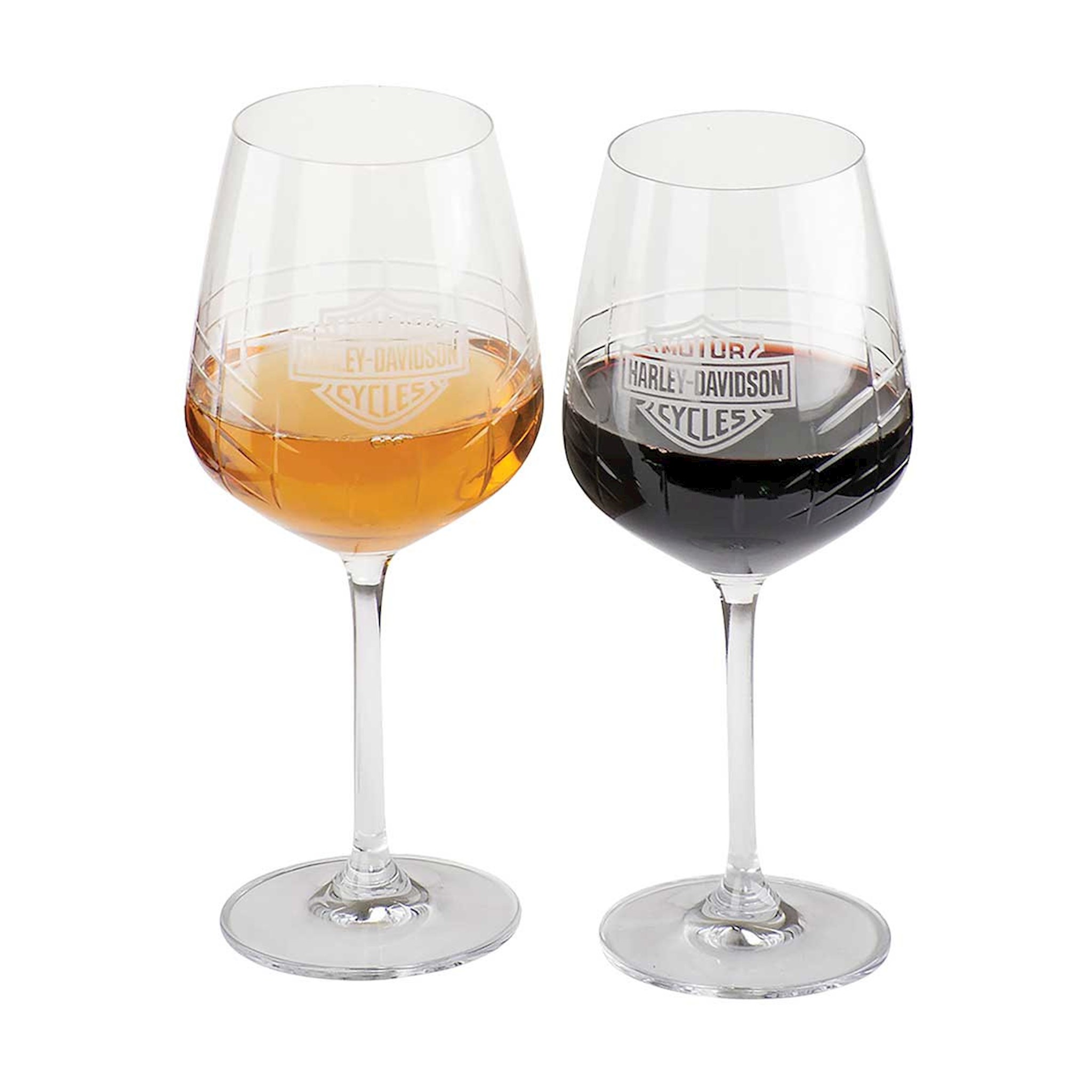 Set of two 20 oz. / 600 ml hand cut crystal wine glasses with frosted Bar & Shield logo. Hand wash only. Matches Premium Wine Set - HDL-18813.
