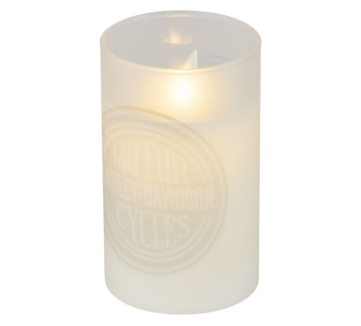 Frosted glass candle holder with Harley-Davidson Circle logo and LED candle insert. Dimensions: 3" diameter x 5" H / 8 x 13 cm.