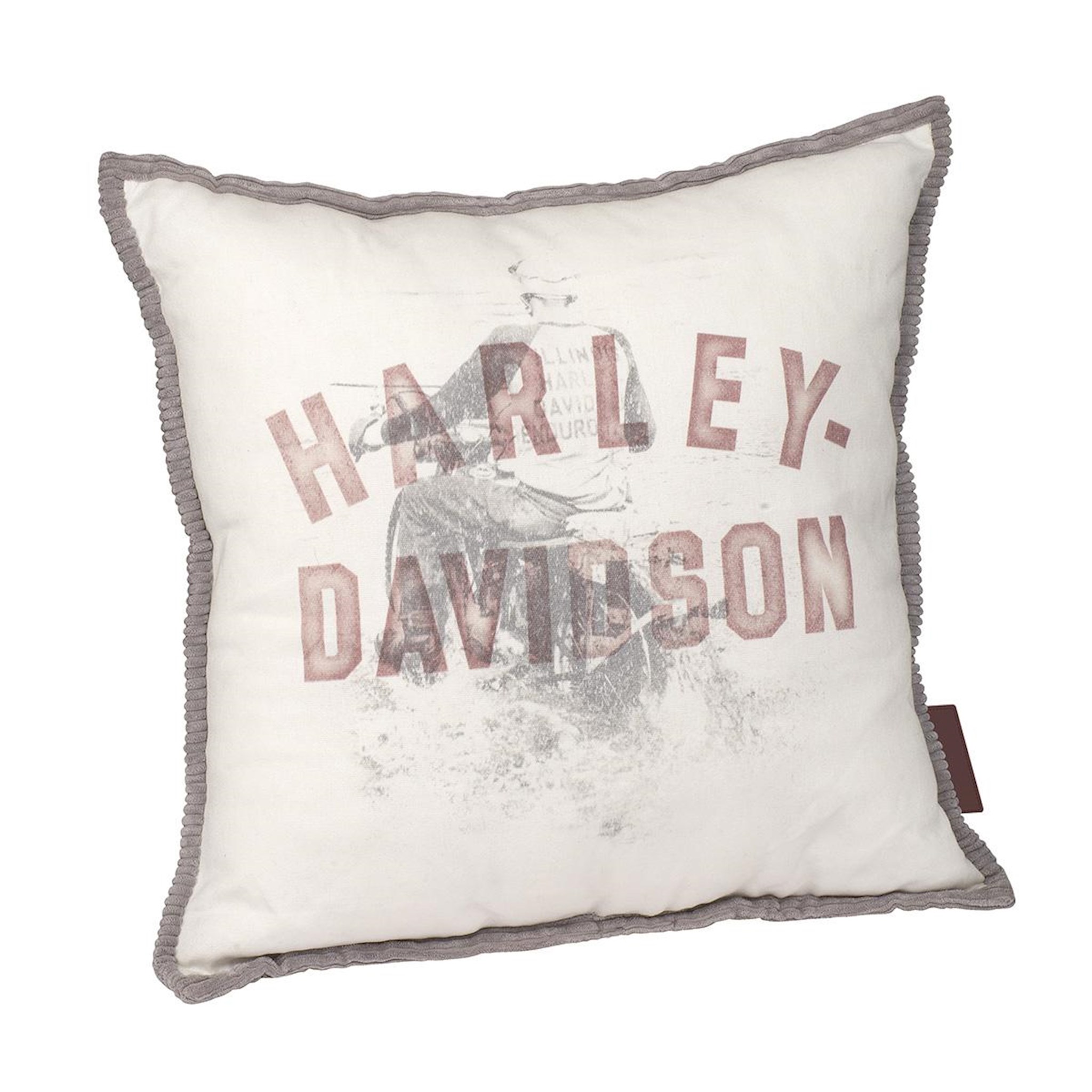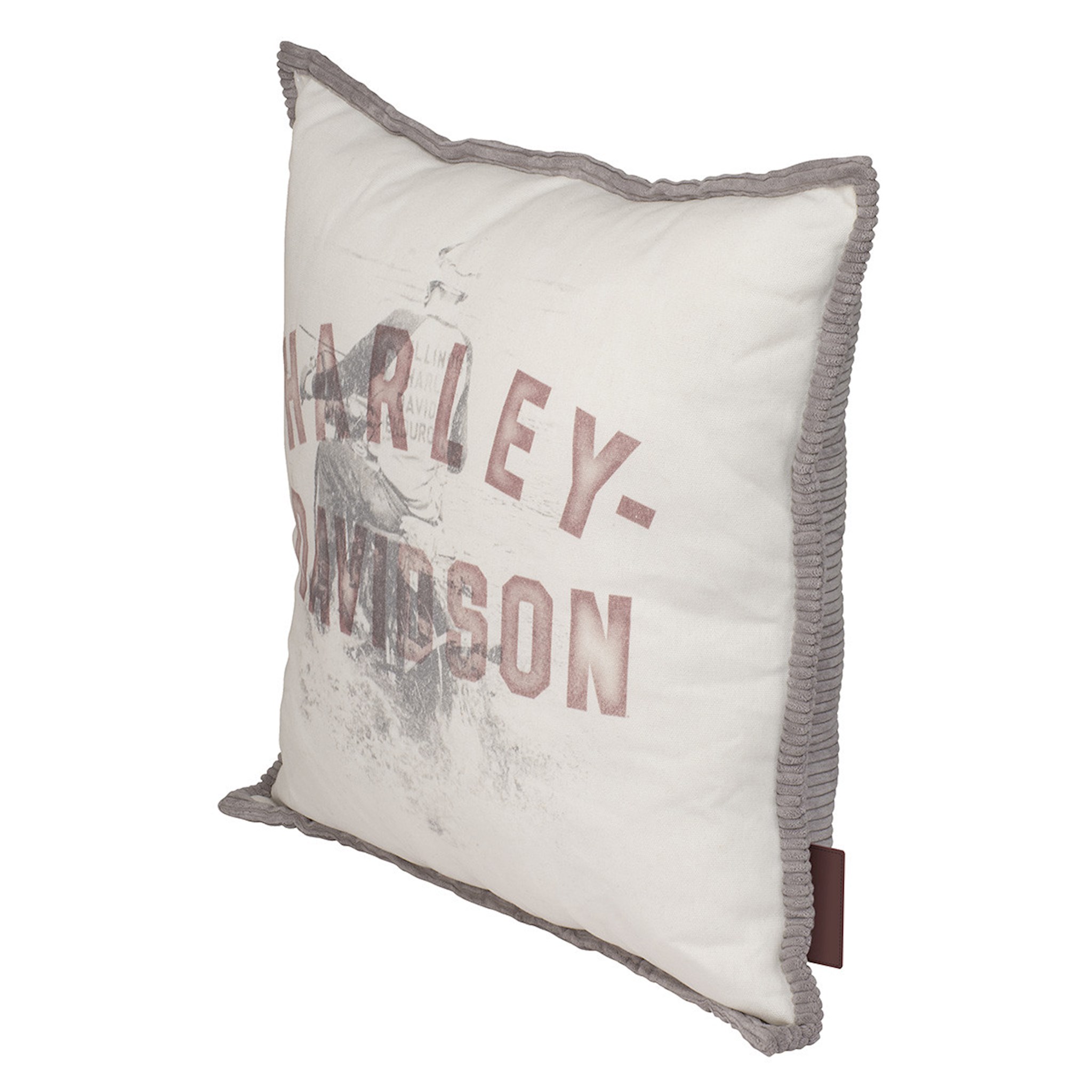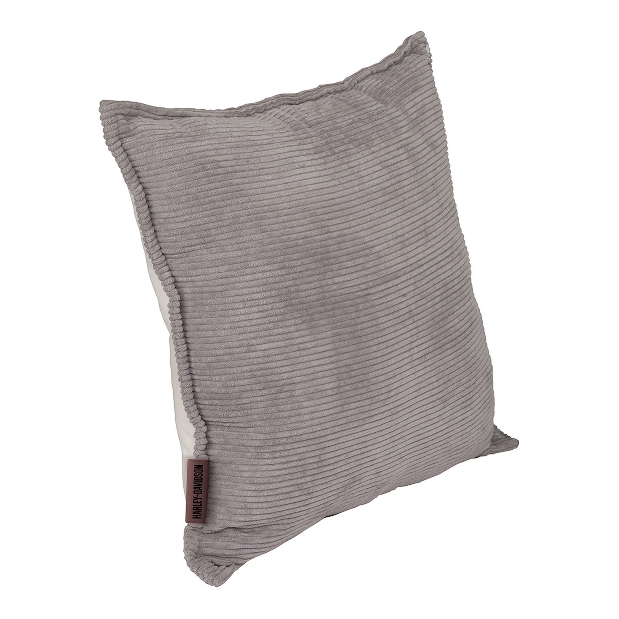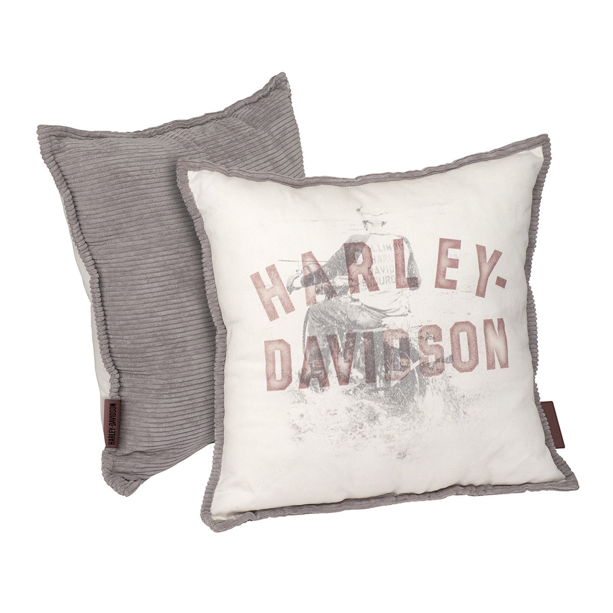 Grey corduroy throw pillow features Harley-Davidson Rider graphic on front. Sewn in leather tag on side. Dimensions: 16" x 16" / 41 x 41 cm.