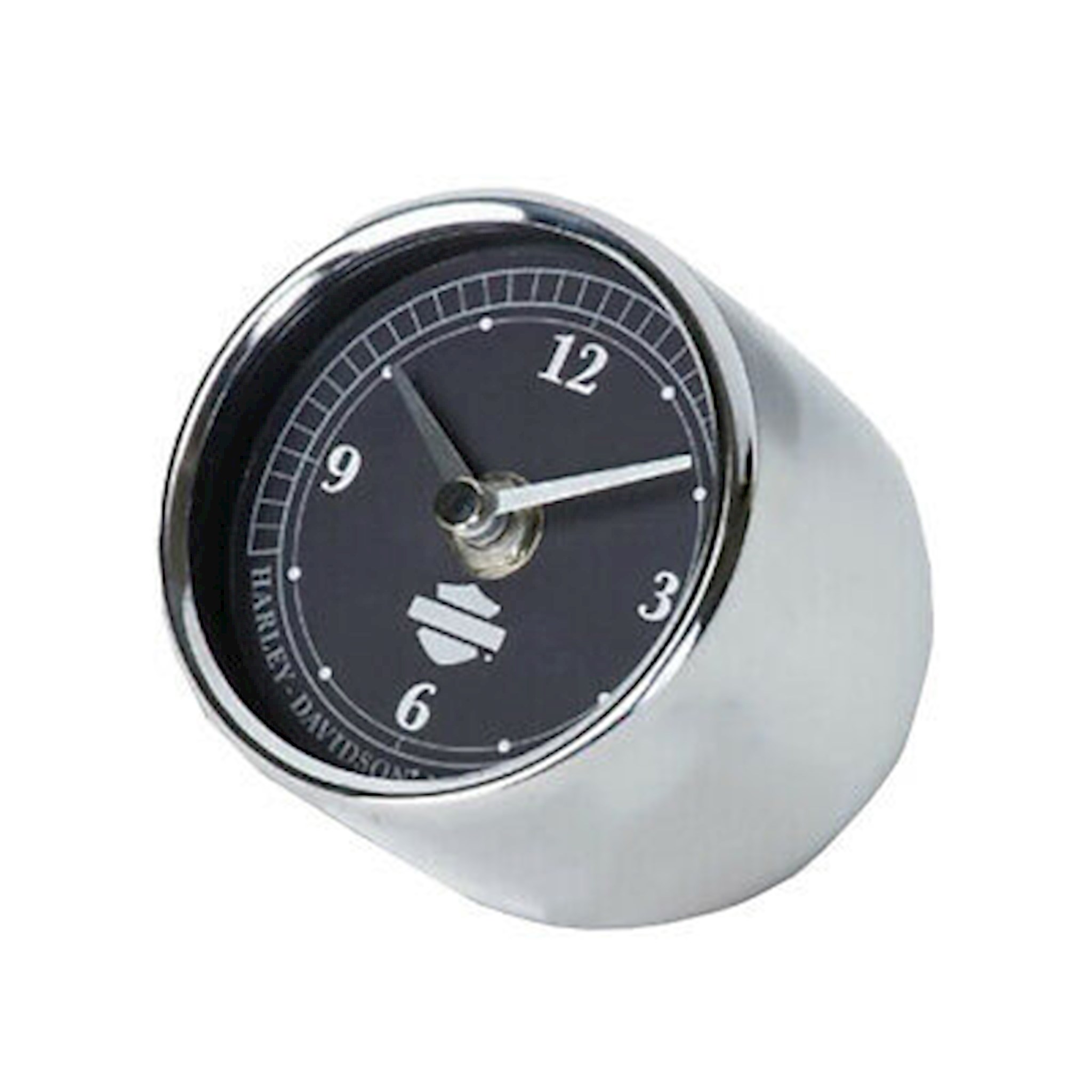 Harley-Davidson® Speedometer Desk Clock, HDL-20119. Chrome plated metal, speedometer style desk clock. Features glass lens, aluminum hands and AA battery operated, continuous sweep movement. Size: 3.375" diameter x 3.75" H. The perfect desk accessory!