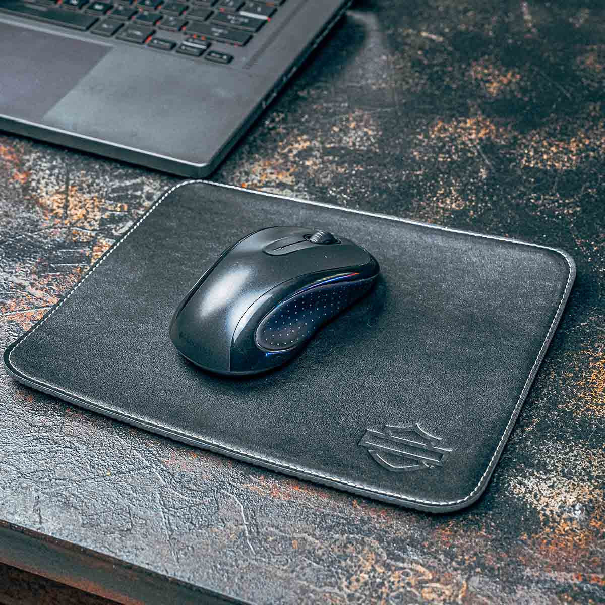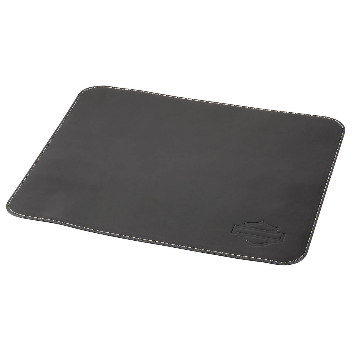 Black faux leather mouse pad with debossed Open Bar & Shield logo. Includes grey contrast stitching and no-slip backing. Dimensions: 9.7" L x 7.5" D / 24 x 19 cm.