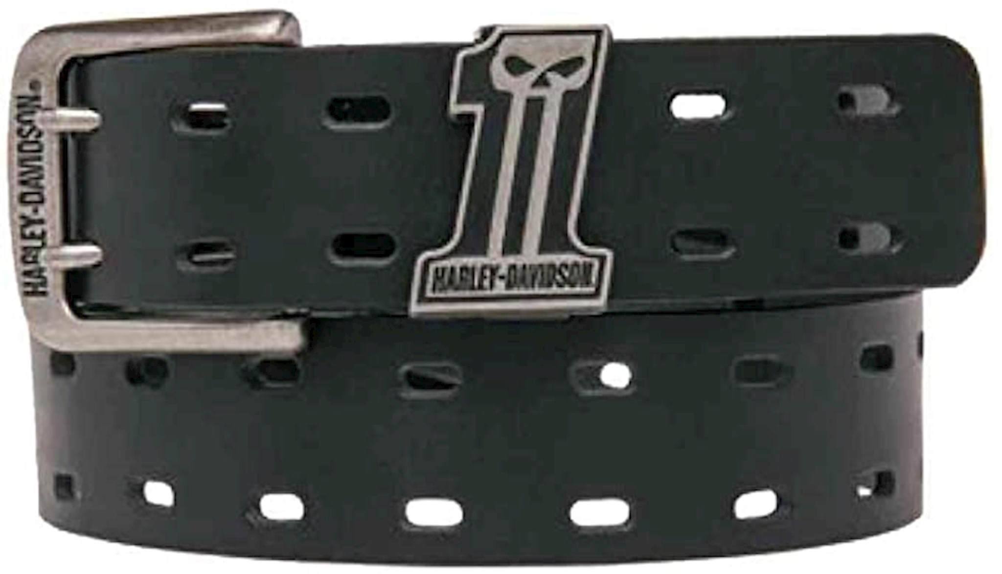Harley-Davidson® Men's Double Down Leather Belt, HDMBT10841-BLK. Genuine black Veg leather belt. Awesome famous #1 skull logo. Antique nickel finish Width: 1.5''. Proudly Made in the USA.