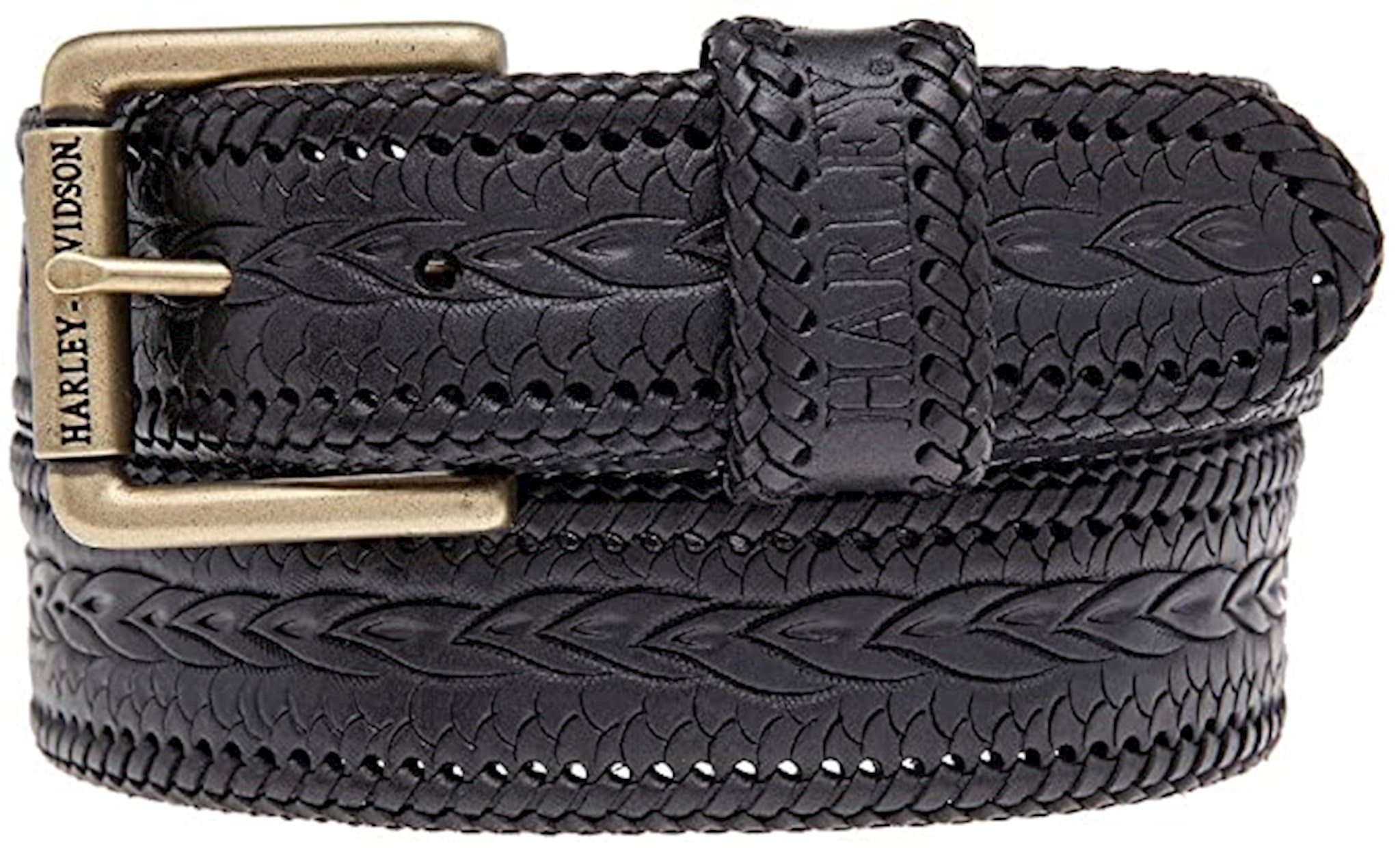 Harley-Davidson® Men's Gravel Genuine Leather Belt, HDMBT10852-BLK. This belt is tough and ready for the ride. Not an inch of faux leather on this belt, constructed from high-quality Genuine cowhide leather with an attractive hand tooled design. Features a hand tooled design on strap. Complete with antique brass finish buckle. Engraved Harley-Davidson® black enamel script on buckle. Excellent quality leather belt, made for those bikers who want the best of everything! Standard width: 1.5". Interchangeable buckle lets you swap out for another belt buckle whenever you want.
