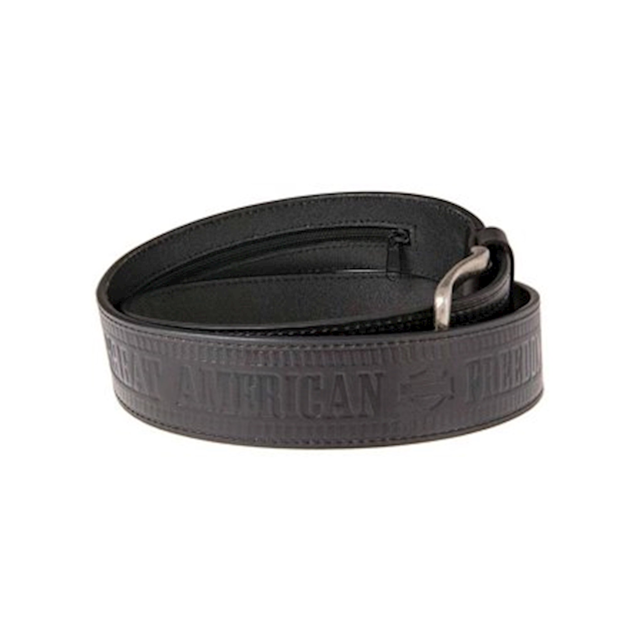 Harley-Davidson® Men's Money Belt, HDMBT11190-BLK. Not an inch of faux leather on this belt, constructed from high-quality Genuine leather. Belt is decorated with an attractive embossed design and finished with embossed script. Flip the belt over to reveal the bonus feature, hidden zippered pocket to store money. Complete with a antique nickel finish buckle. Excellent quality leather belt, made for those bikers who want the best of everything! Standard width: 1.5". This belt is tough and ready for the ride.