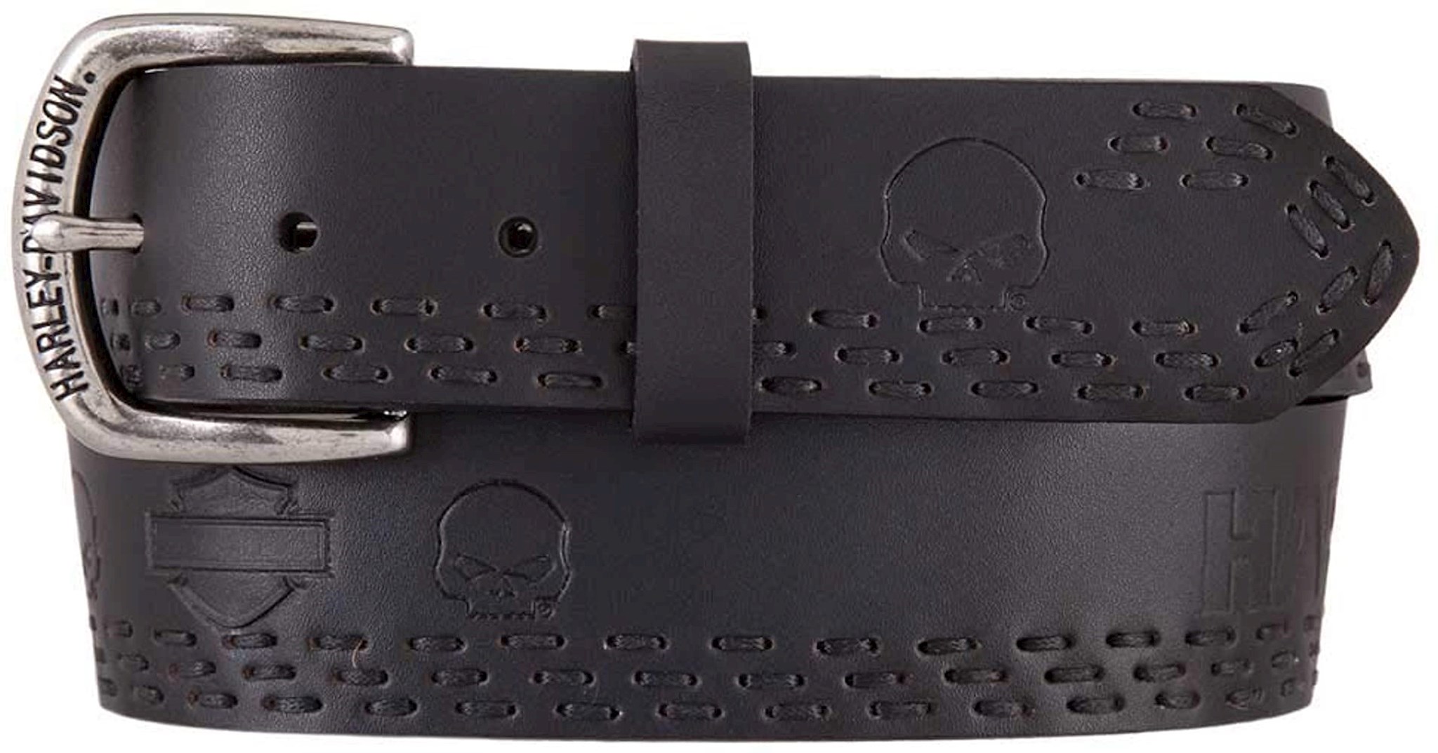 Harley-Davidson® Men's Eliminator Genuine Leather Belt, HDMBT11439. Stunning, one of a kind belt! This belt is tough and ready for the ride. Not an inch of faux leather on this belt, constructed from high-quality Genuine cowhide leather with a smooth texture. The face of this belt is covered in a braided and embossed design. Harley-Davidson® script buckle with antique nickel finish. Excellent quality leather belt, made for those bikers who want the best of everything! Standard width: 1.5". Interchangeable buckle lets you swap out for another belt buckle whenever you want