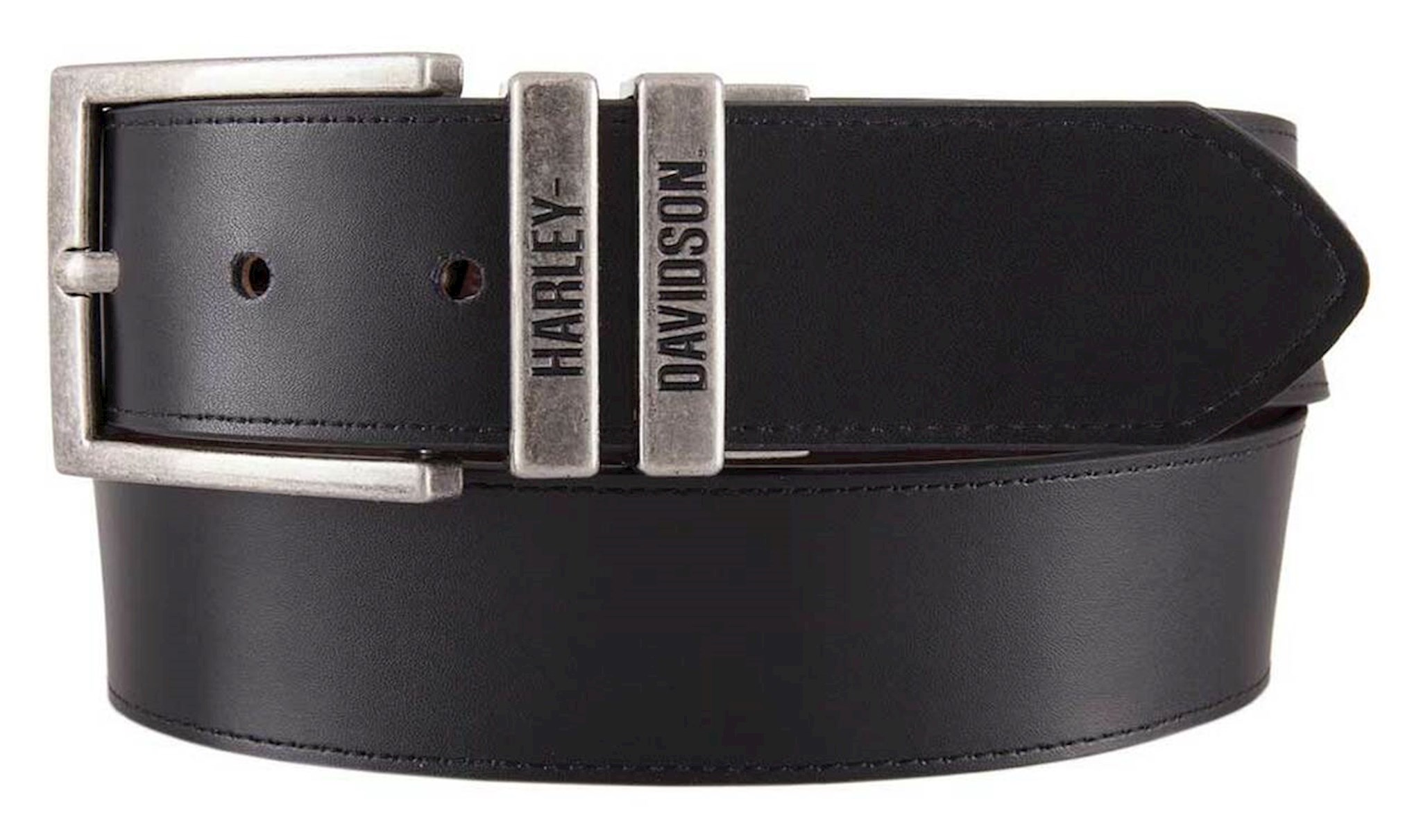Harley-Davidson® Men's U-Turn Reversible Genuine Leather Belt, HDMBT11542. Stunning, one of a kind belt! This belt is tough and ready for the ride. Not an inch of faux leather on this belt, constructed from high-quality Genuine cowhide leather with a smooth and debossed texture. Reversible belt, black and brown belt in one. Smooth texture on black side, perfect for business. Brown side is decked out in debossed H-D designs. Harley-Davidson® script on loops and buckle with antique nickel finish. Excellent quality leather belt, made for those bikers who want the best of everything! Standard width: 1.5".