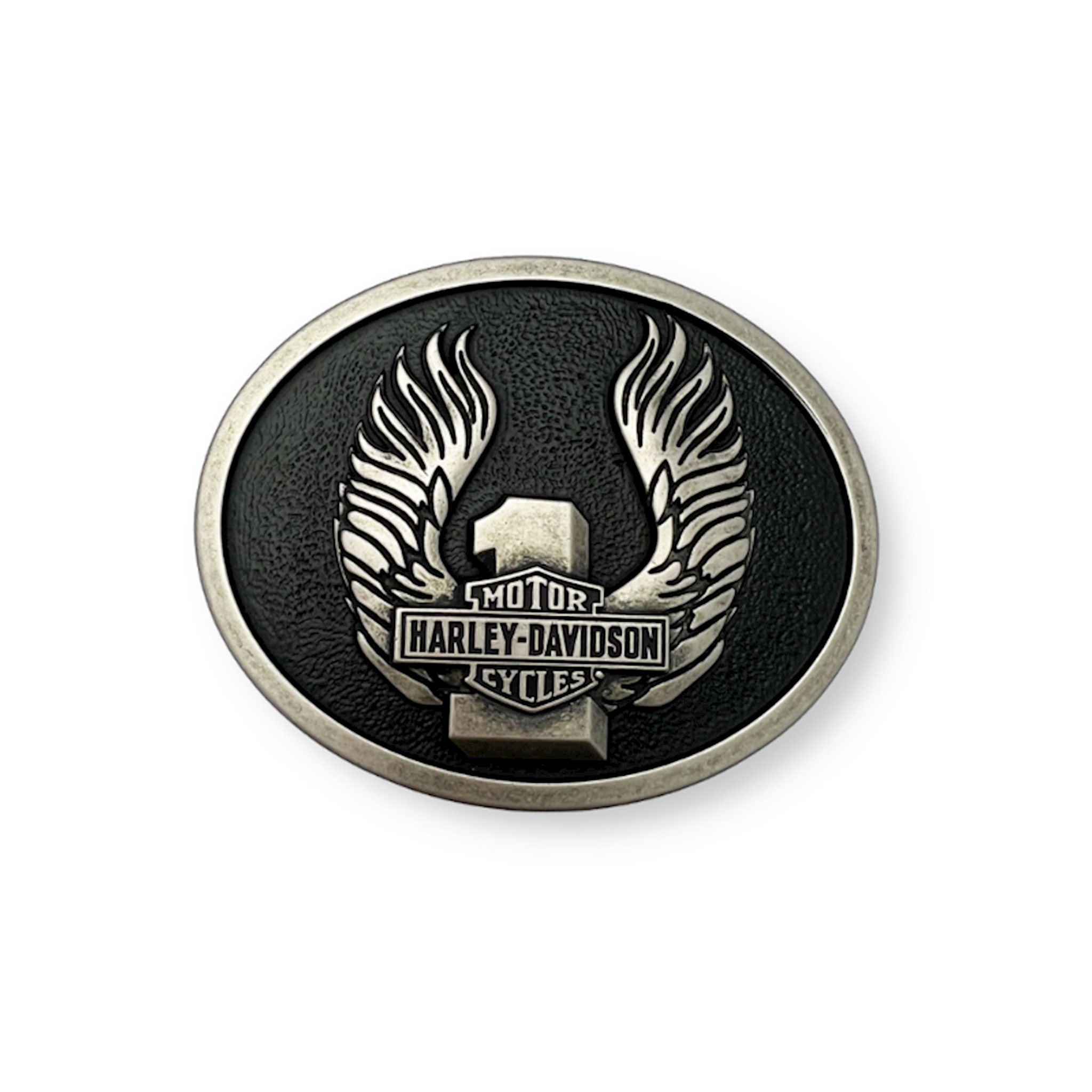 Harley-Davidson® Mens One Logo Trademark B&S Black. • Light Antique Nickel Roller Finish. • Fits 40mm Wide Strap. • Collector Buckle.