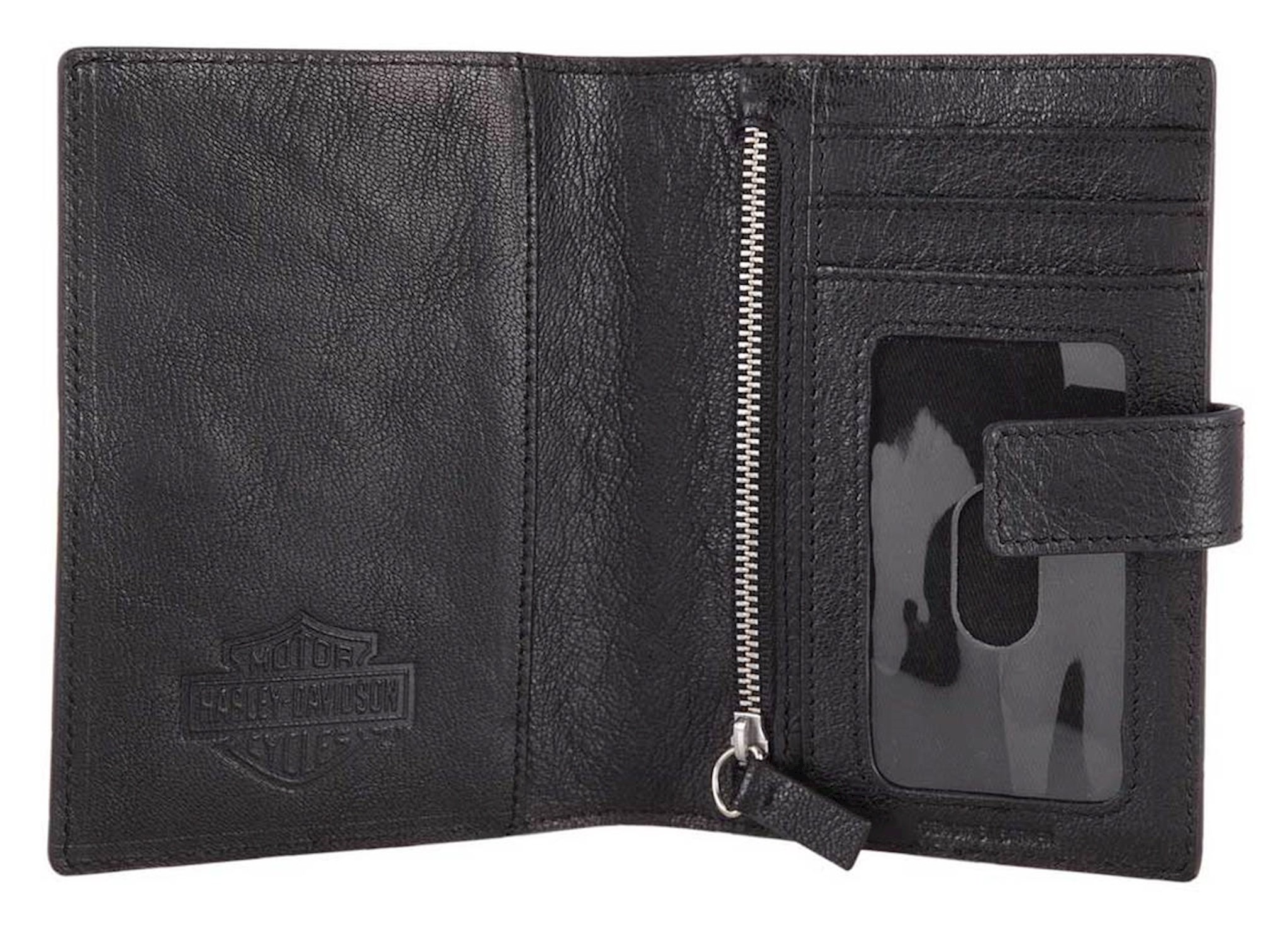 Harley-Davidson® Classic Passport Wallet. Made of high-quality black Genuine leather with a smooth texture. Features embossed Bar & Shield logo with Harley-Davidson® script. Secure double snap closure. Interior features: passport slot, two credit card slot, ID window and zippered coin pocket. RFID Protection, blocks hackers from reading your information. Polished nickel finish. Size: 6" x 4.25".