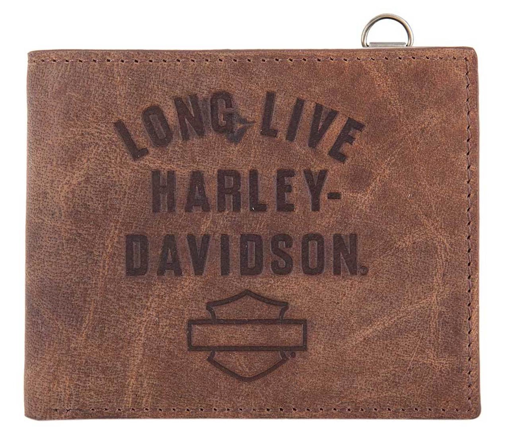 Harley-Davidson® Men's Long Live Bi-Fold Wallet. Part of the Garage Collection. Made of high-quality distressed brown genuine leather with a smooth, soft texture. The best materials make up the long-lasting wallets. Features a debossed 'Long Live' design, featuring Harley-Davidson® script. Interior features: 6 credit card slots, ID window, 2 cash slots and snap closure coin pocket. Antique nickel finish. RFID Protection, blocks hackers from reading your information. Size: 4.25" x 3.5". Perfect size to fit in the pocket of your jacket or jeans