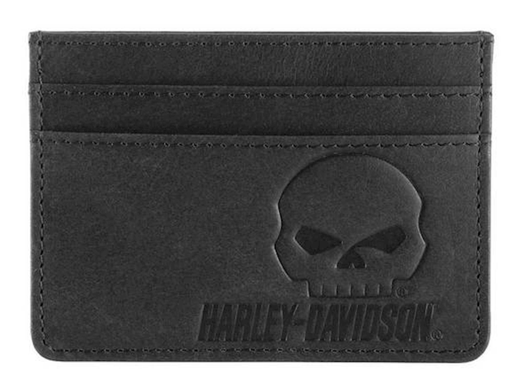 Harley-Davidson® Men's Outsider Card Case Wallet. Made of high-quality black genuine leather with a smooth, soft texture. Features an embossed Willie G Skull logo with famous Harley-Davidson® script. Features 2 credit card slots on each side. RFID Protection, blocks hackers from reading your information. Size: 4" x 3". Perfect size to fit in the pocket of your jacket or jeans. Comes in a black gift tin.