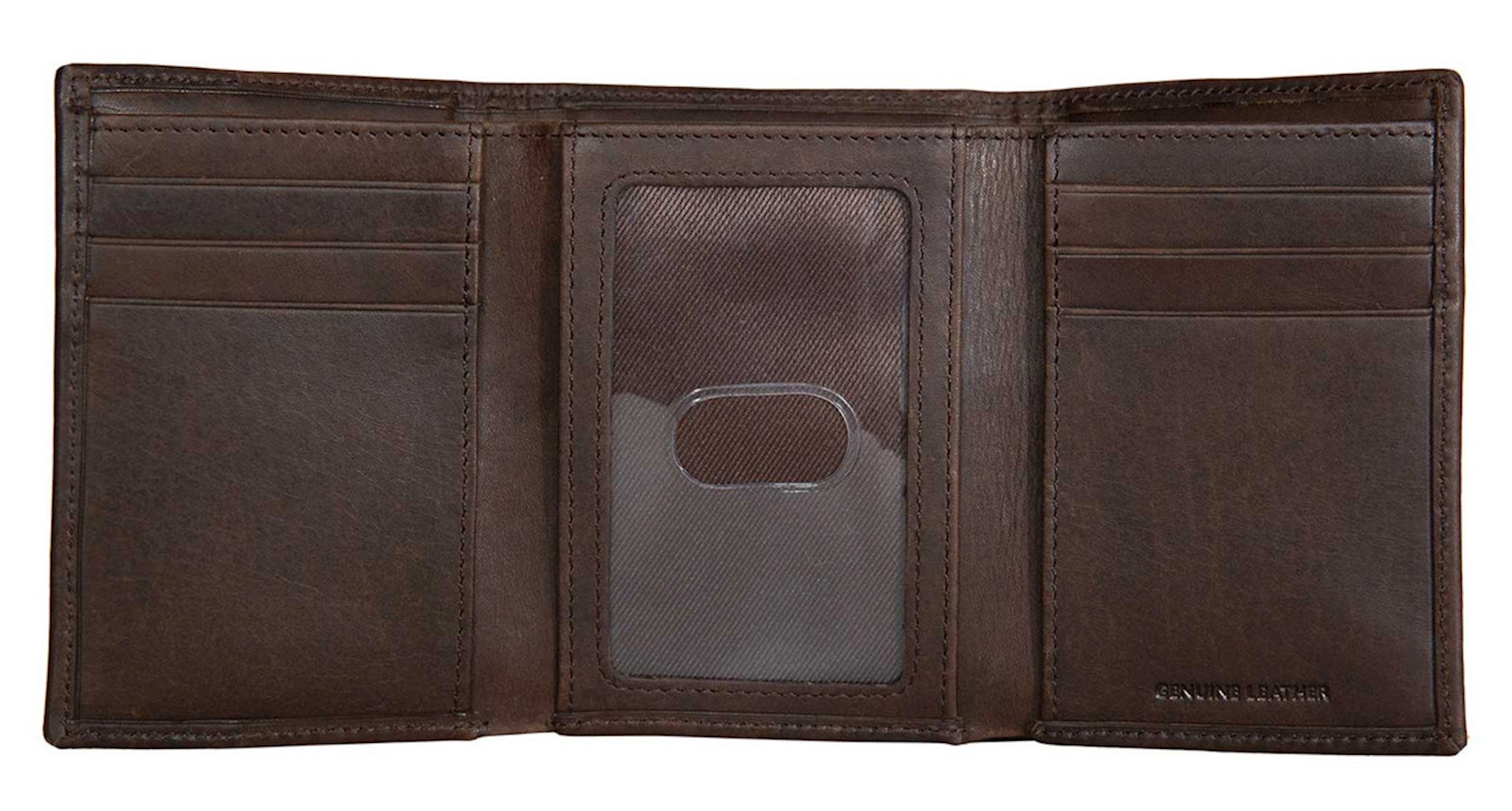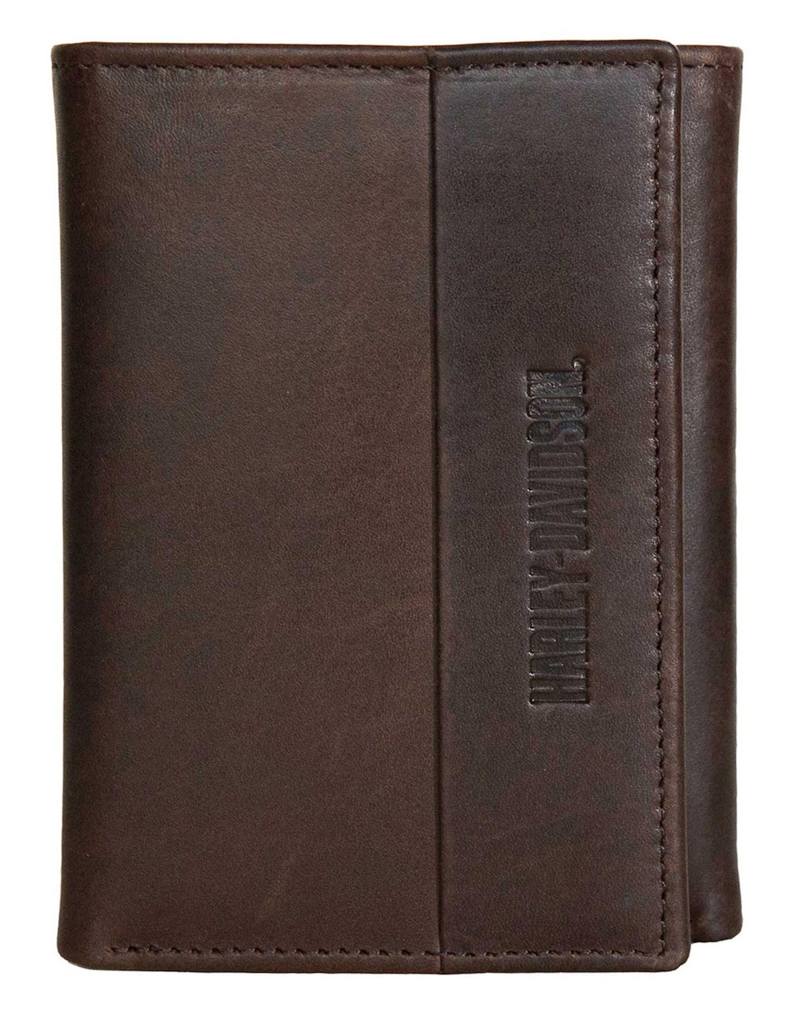 Harley-Davidson® Men's H-D Signature Tri-Fold Wallet - Brown, HDMWA11791-BRN. Made of high-quality black genuine leather with a super soft smooth feel. The best materials make up the long-lasting wallets. Features an iconic debossed H-D® script. Interior features: 6 credit card slots, ID window and cash slip pocket. RFID Protection, blocks hackers from reading your information. Size: 4.5" x 3.25".