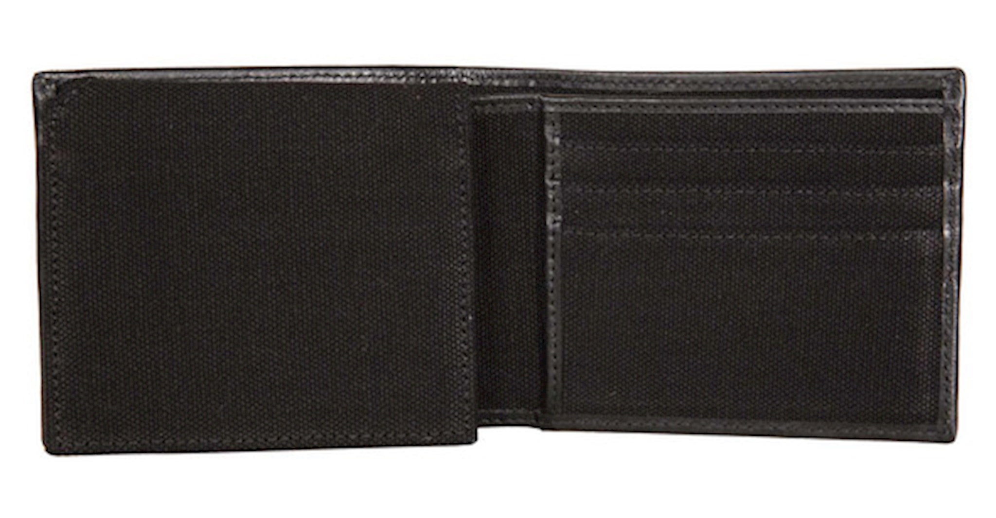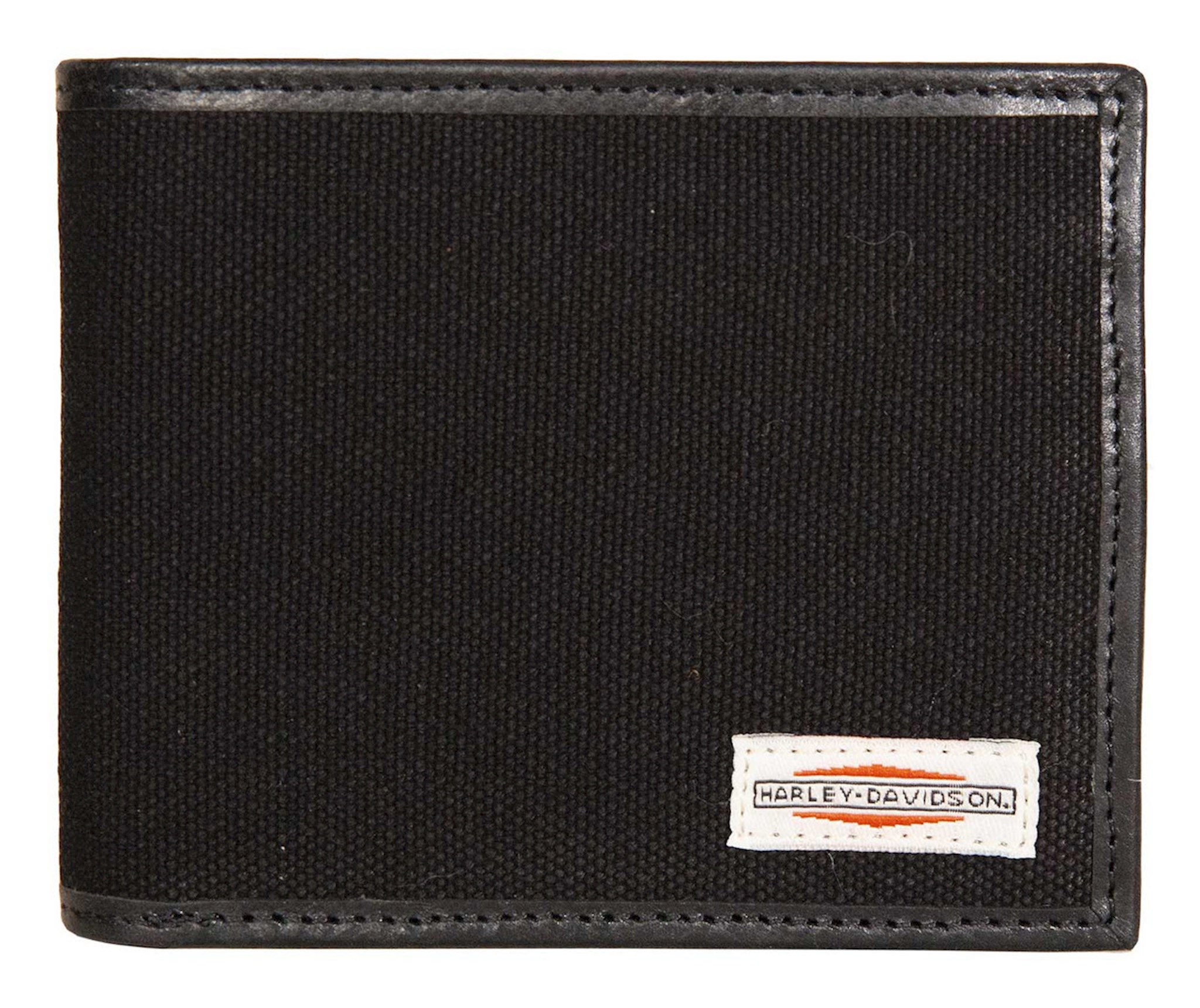 Harley-Davidson® Men's Canvas Bi-Fold Wallet - Black, HDMWA11792-BLK. Made of high-quality cotton canvas with Genuine leather trim. The best materials make up the long-lasting wallets. Interior features: 5 credit card slots, ID window and 2 cash slip pockets. RFID Protection, blocks hackers from reading your information. Size: 4.5" x 3.5".