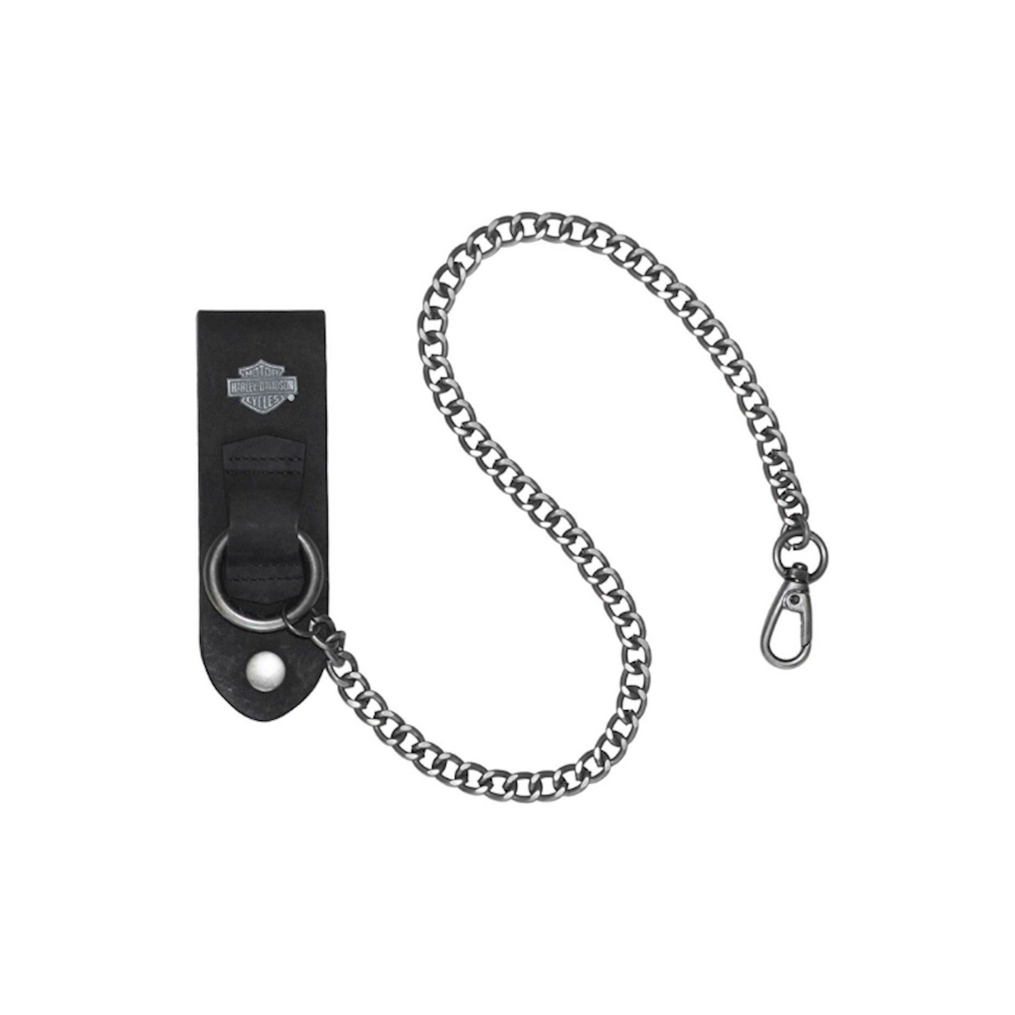 Harley-Davidson® Men's Bar & Shield Wallet Chain, HDMWC11752. Great looking antique nickel finish on chain and lobster clip, goes perfect with any distressed wallet. Heavy-duty 24" wallet chain with a lobster clip and a Genuine leather strap on ends to keep it secure. Extremely well constructed chain.