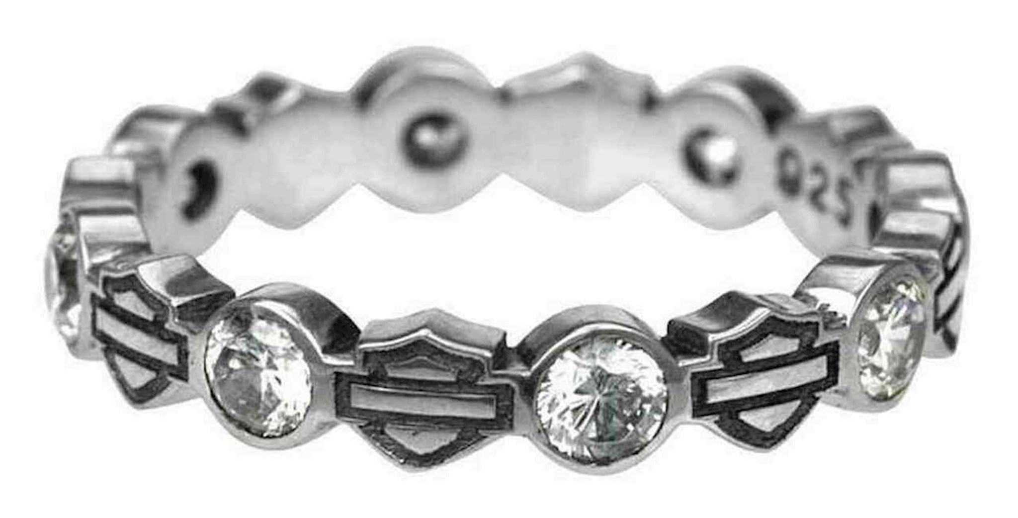Harley-Davidson® Women's Stacking Bar & Shield Rhinestone Ring, HDR0170. This ring is hand-crafted with the highest attention to detail and quality, utilizing the finest materials. Features beautiful repeating outline Bar & Shield logos with white rhinestones. Made of sterling silver.