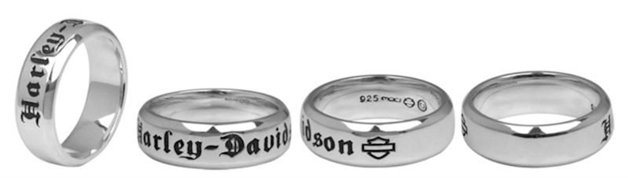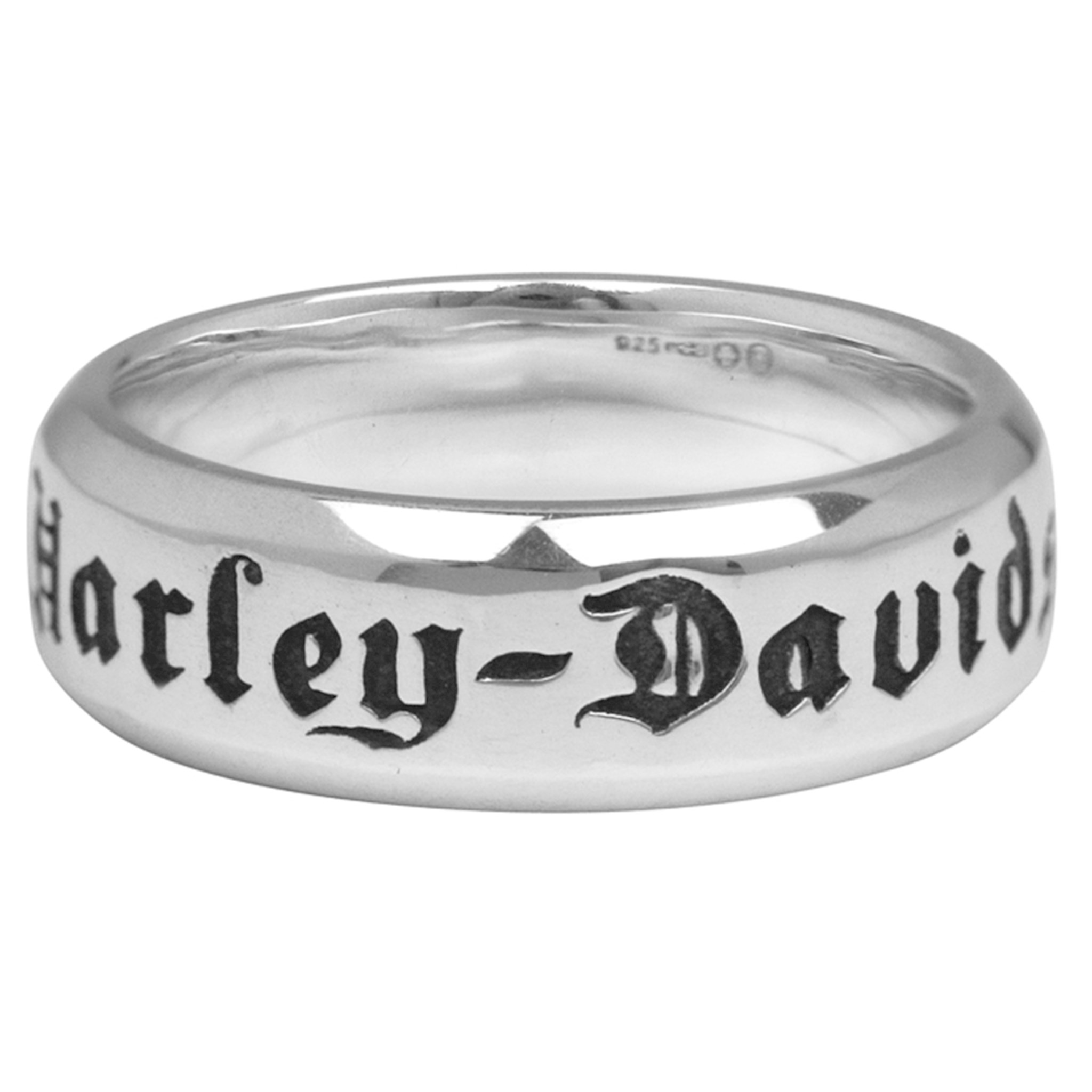 Harley-Davidson® Men's Couple's Band Ring, HDR0217. This simply stated 7 mm wide Men's Wedding Band by Harley-Davidson® features a Old English lettering set into a high-polished, smooth Comfort Fit Sterling Silver Band.