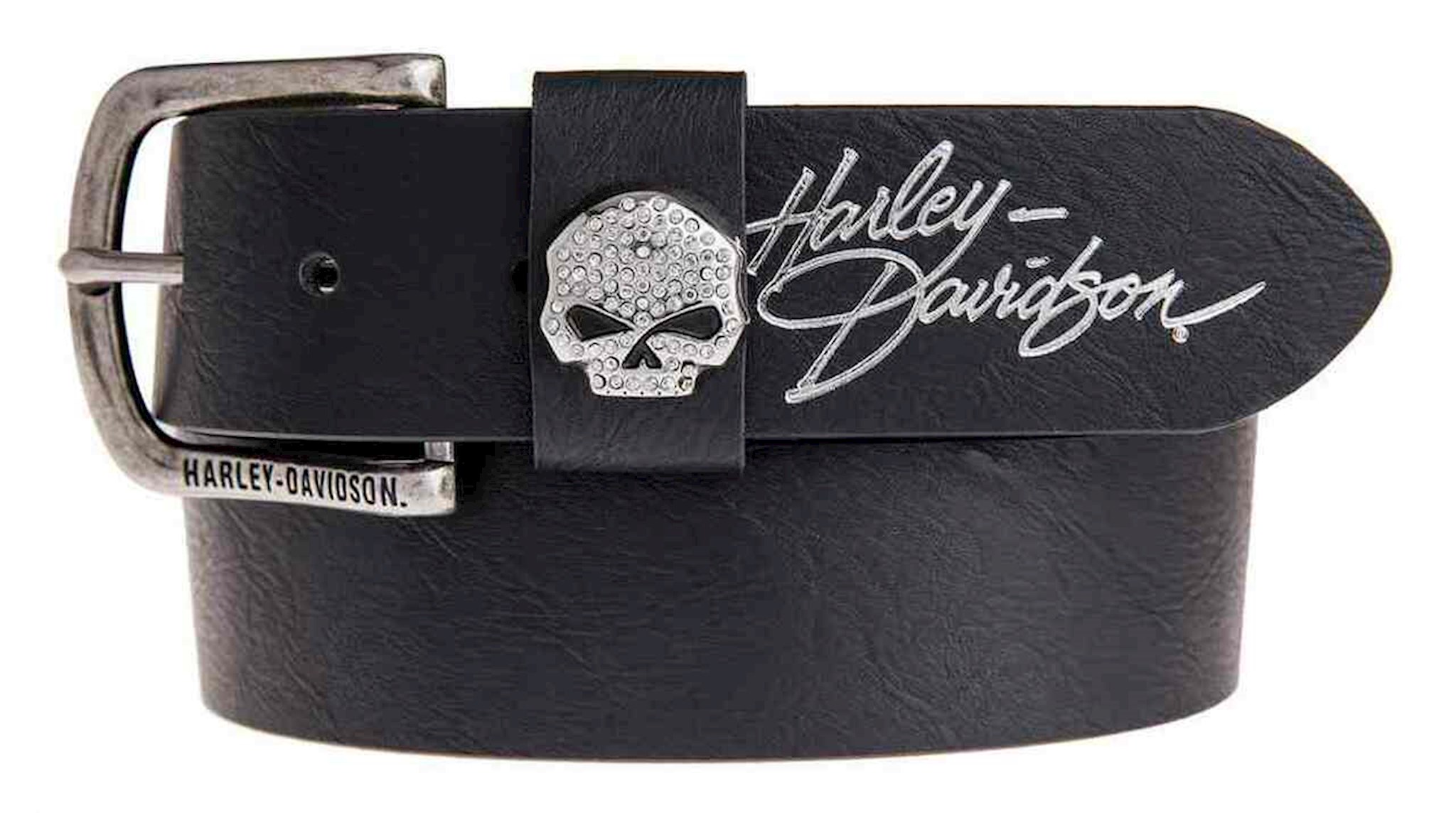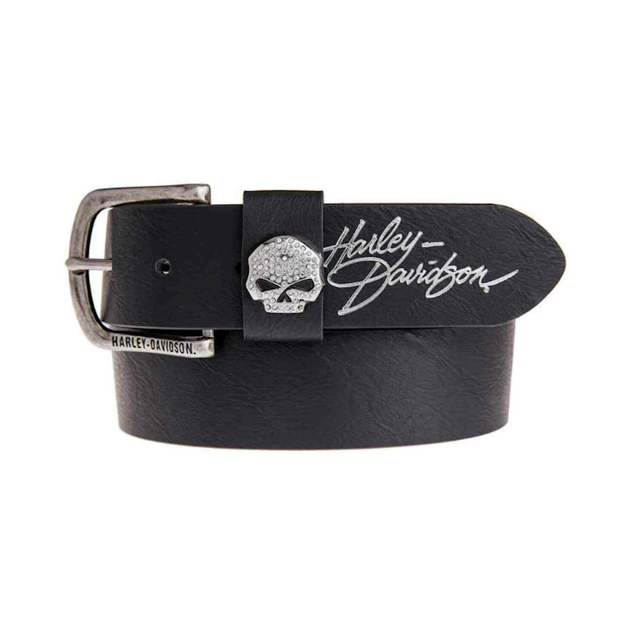 Harley-Davidson® Women's Rock Candy Belt and Buckle, HDWBT11023-BLK. When a plain black belt just won’t do, you’ll reach for this one. Yes it is black, but with just the right touch of embellishment. Made of high-quality genuine black leather, the keeper has a gorgeous Willie G skull, embellished with crystals. Once you have threaded the belt through your belt loops, buckle it up and slide the end through the keeper to reveal a matching silver foil Harley-Davidson® cursive logo, which has just the right amount of feminine flourish. The nickel finished buckle has an enamel filled engraving of Harley-Davidson® on the bottom. The end result is an understated elegance you’ll enjoy for years. The belt is a standard width of 1.5-inches – a perfect accessory to any outfit! Available in sizes, Small-33”, Medium-35”, Large-38”, and X-Large-41”. Made under Harley-Davidson® license by Lodis Accessories, Inc., a licensee known for their expert craftsmanship. Their talented designers are consistently in pursuit of distinctive details, quality materials and exquisite designs in order to serve the demanding expectations of Harley® enthusiasts.