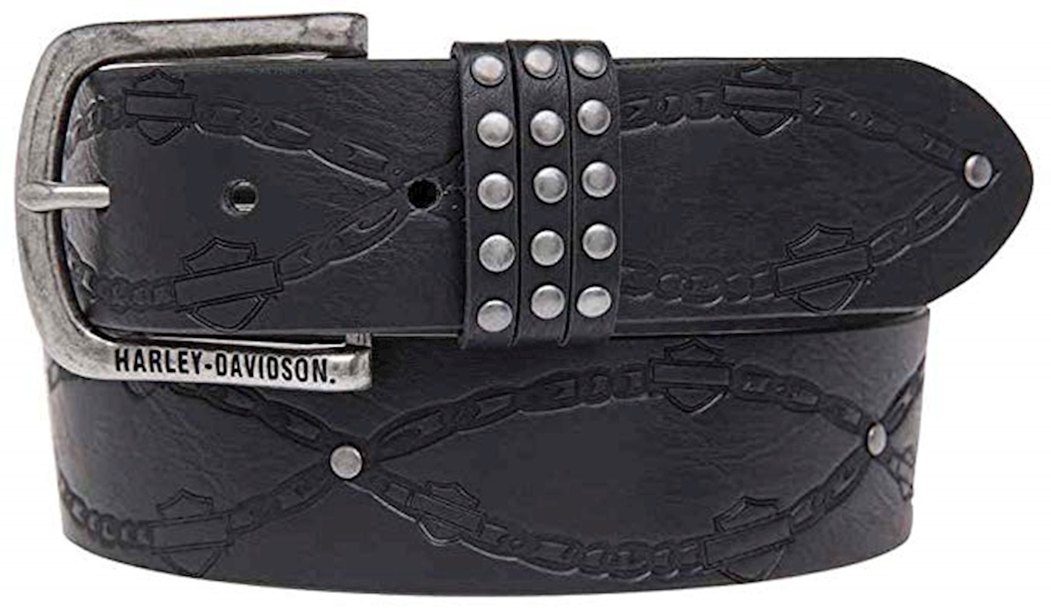 Harley-Davidson® Black Women's Linked Belt, HDWBT11026-BLK. Crisscrossed debossed chains link to silhouette Harley-Davidson® Bar & Shield® logos in this innovative moto chic studded belt. The studs tie everything together, both on the belt and the three bar keeper. An antique nickel finish is used on the classic center bar buckle and studs. An engraved, black enamel filled Harley-Davidson® logo also adorns the buckle. The end result is an edgy elegance you’ll enjoy for years. Made of high-quality black genuine leather lining with a smooth texture. The belt’s width is a standard 1.5-inches, and is a perfect accessory to “Biker-Up” any outfit! Available in sizes, Small-33”, Medium-35”, Large-38”, and X-Large-41”. Made under Harley-Davidson® license by Lodis Accessories, Inc., a licensee known for their expert craftsmanship. Their talented designers are consistently in pursuit of distinctive details, quality materials and exquisite designs in order to serve the demanding expectations of Harley® enthusiasts.