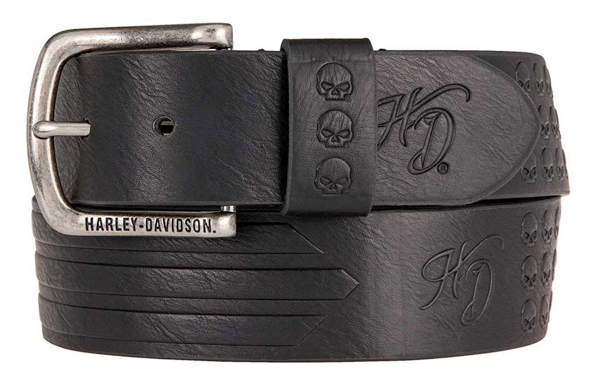 Harley-Davidson® Women's Skulls & Stripes Leather Belt, HDWBT11205-BLK. Take Willie G’s famous skull logo with you when you reach for this leather belt - it’ll be a welcome addition to your wardrobe accessories. This belt has so much going on you won't know where to look first! The belt features all-over debossed Willie G skull logos and racing stripes. The belt’s keeper is also embellished with three skulls, and the tip features a feminine H-D® logo. The final touch is an antiqued nickel buckle, featuring an engraved Harley-Davidson® black enamel logo in block lettering. The leather has a nice textured finish, made for those bikers who want the best of everything! The width is the standard 1.5-inches, the perfect accessory to "Biker-Up" any outfit!