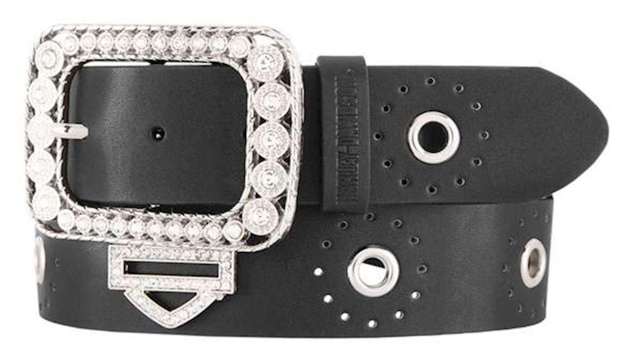 Harley-Davidson® Women's Light up the Night Leather Belt - Black, HDWBT11696. Not an inch of faux leather on this belt, constructed from high-quality Genuine black leather. This belt has so much going on you won't know where to look first! The face of this belt is covered in beautiful rhinestone embellished Bar & Shield logos and silver eyelet design. Stunning polished nickel buckle decorated with rhinestone embellishment. Excellent quality leather belt, made for those bikers who want the best of everything! Perfect accessory to "Biker-Up" any outfit! Width: 1.5". Interchangeable buckle lets you swap out for another belt buckle whenever you want.