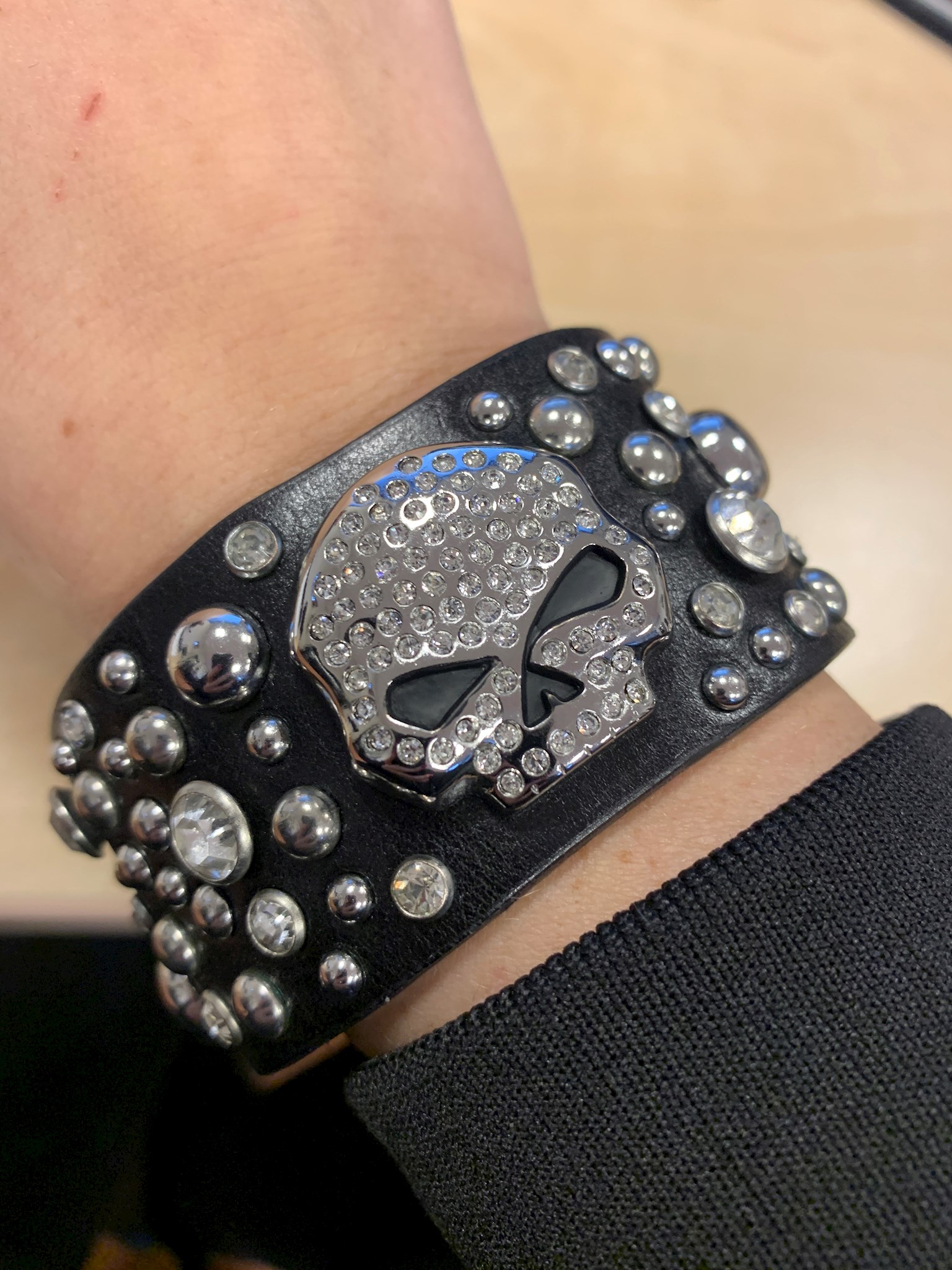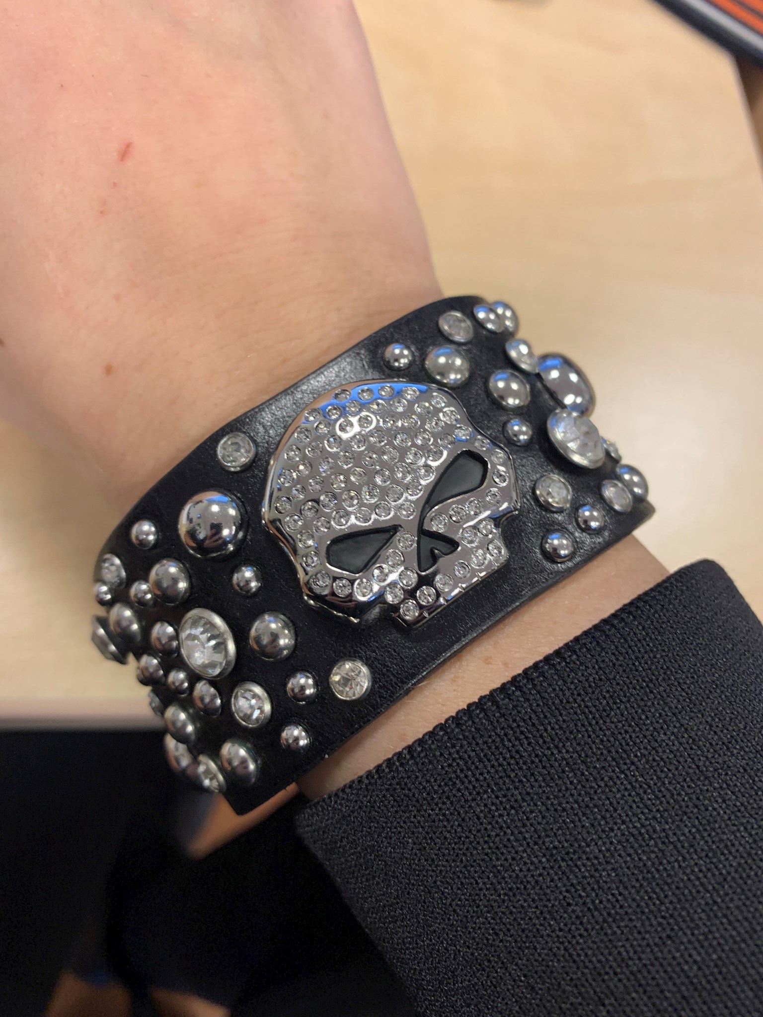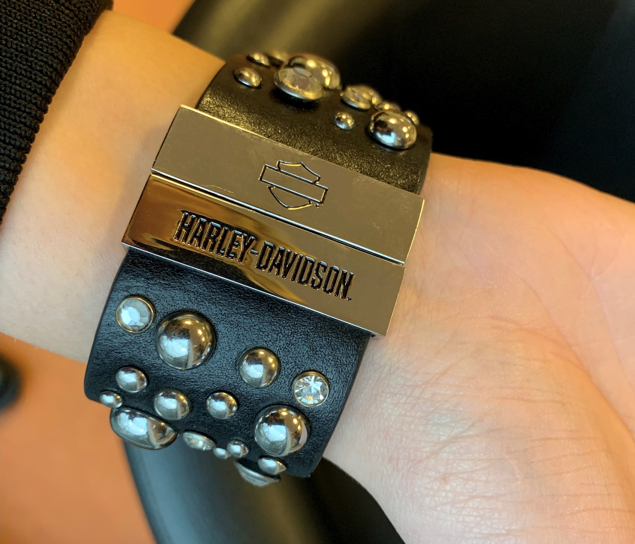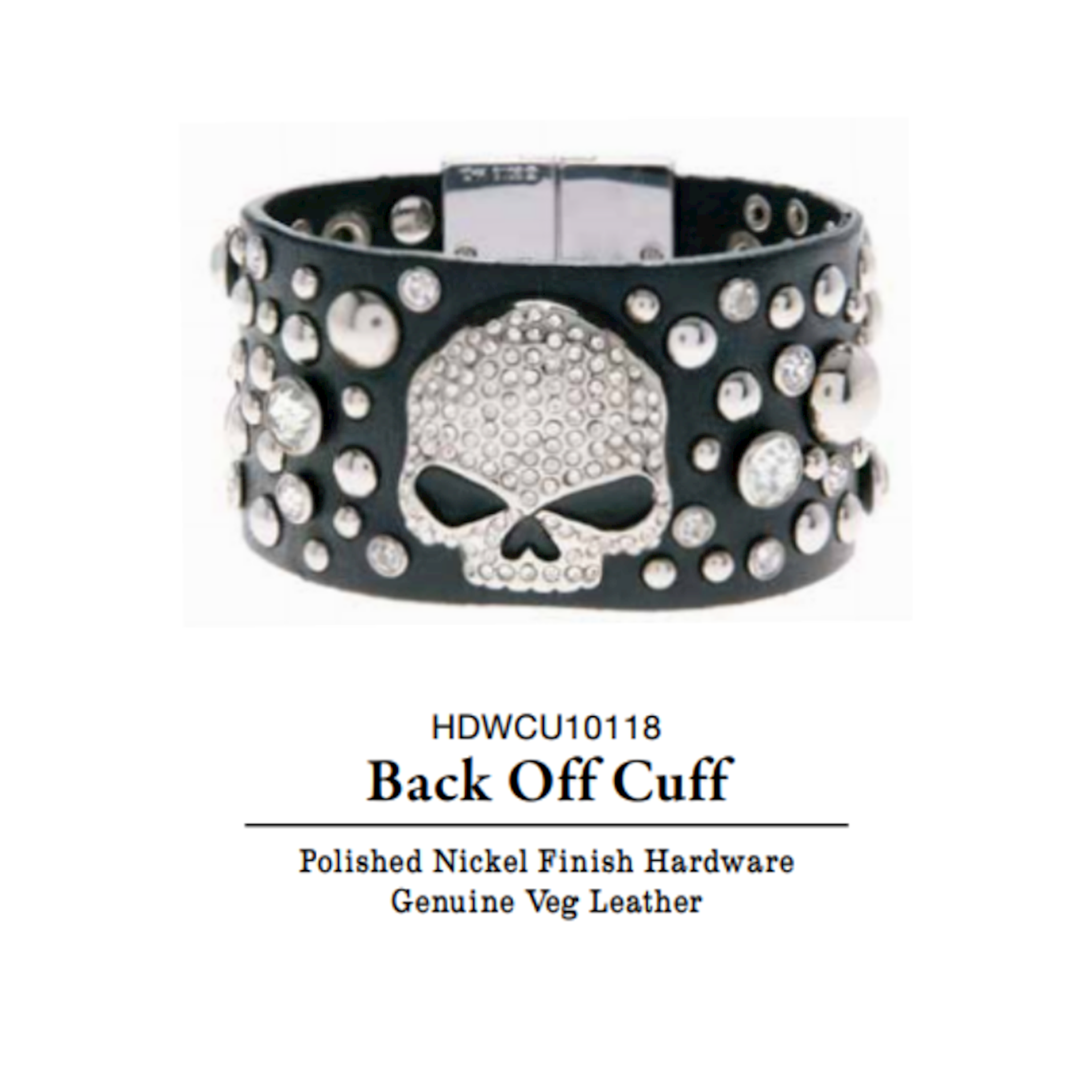 Harley-Davidson® Women's Willie G. Skull Back Off Wrist Cuff. Features a Willie G Skull with clear crystals. Studded detailing and clear crystals. Magnetic closure. Size M/L – 8''. Comes to you in a black gift box.