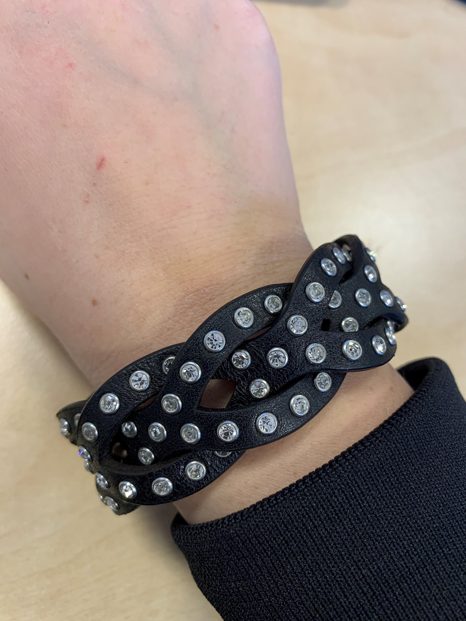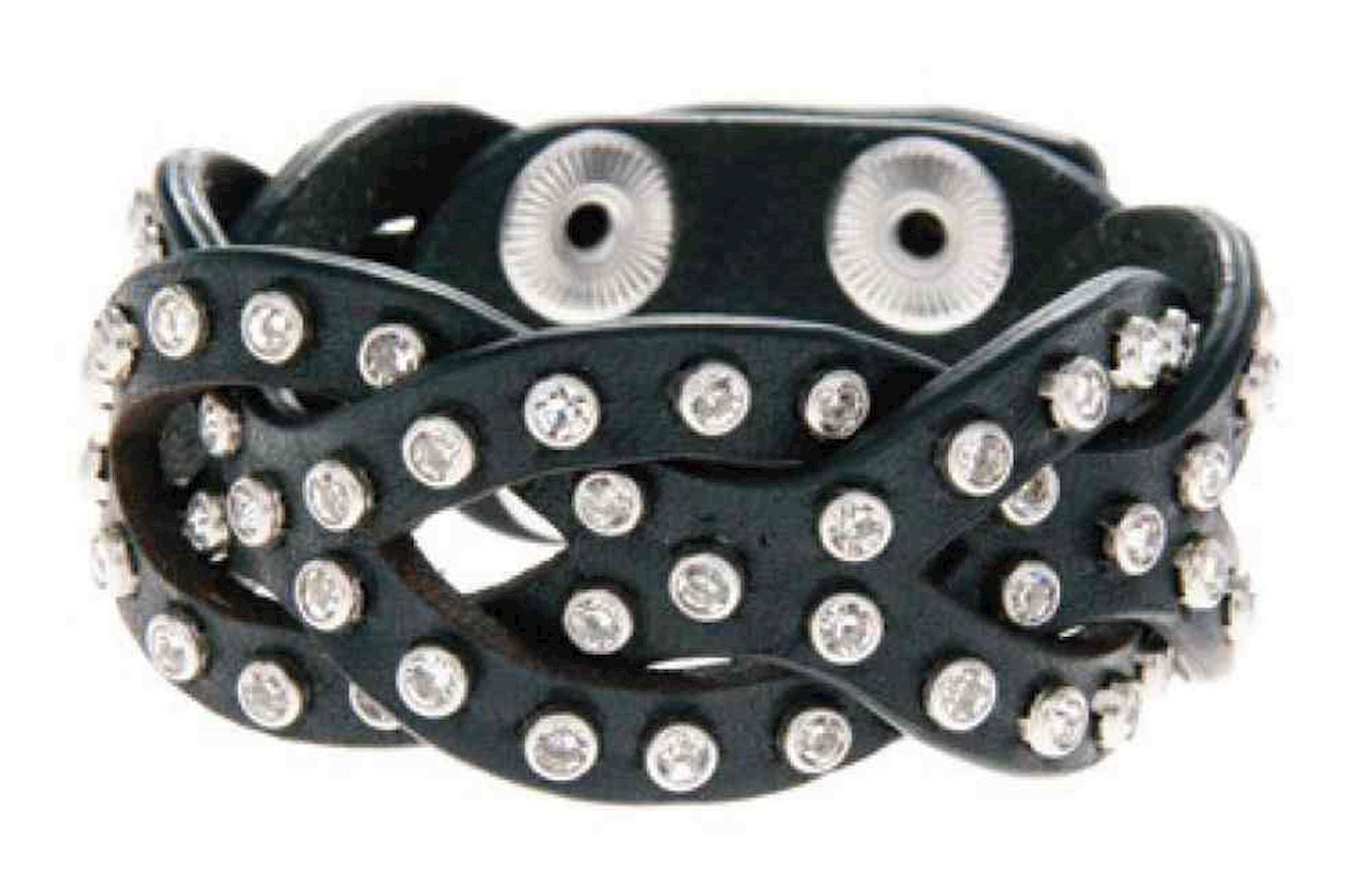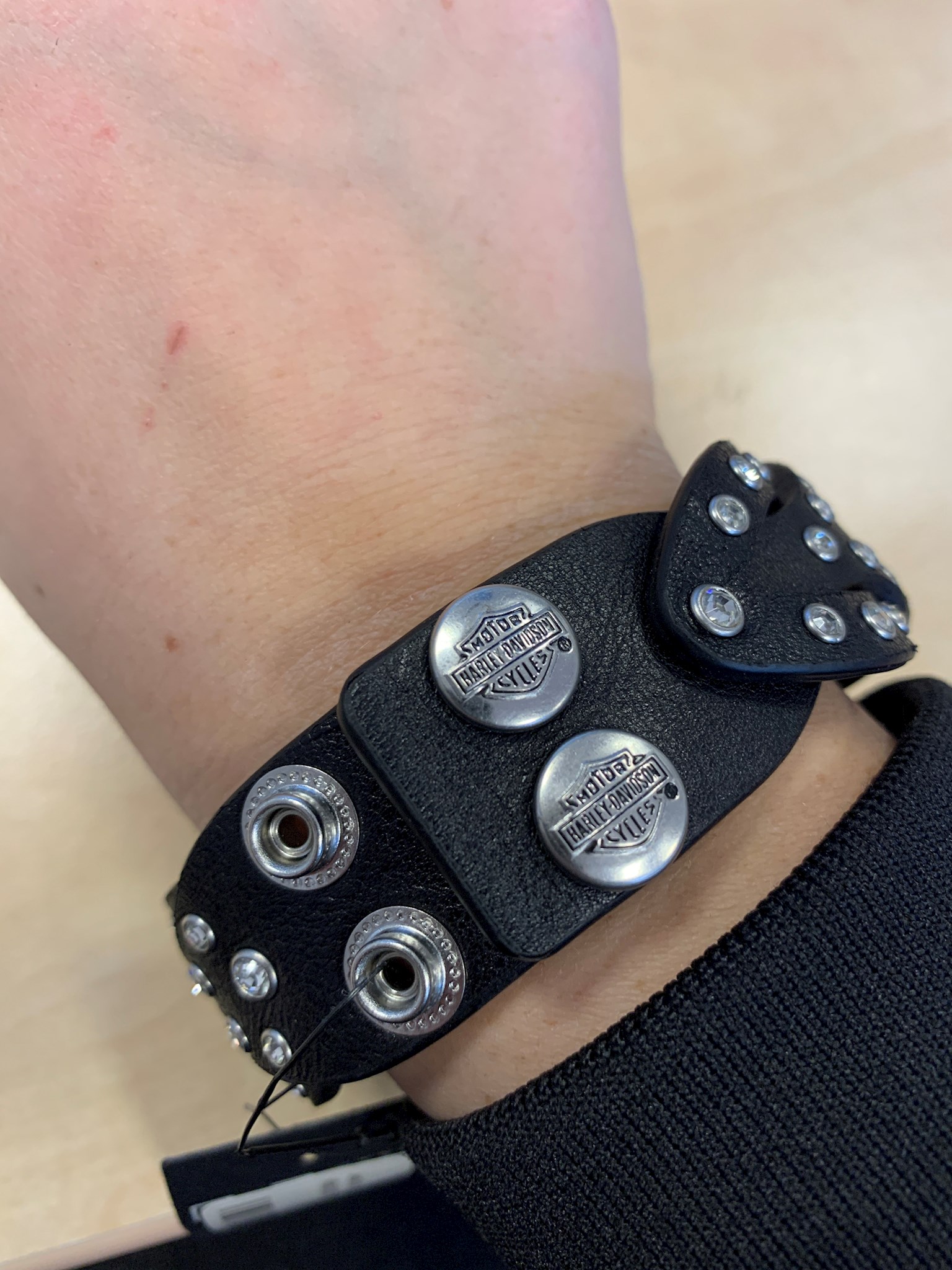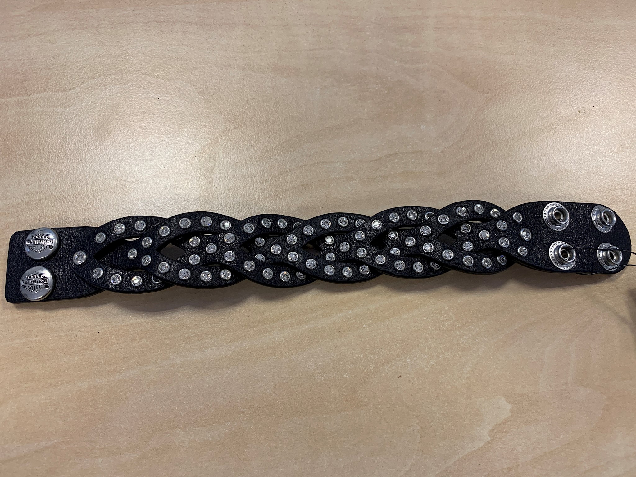 Harley-Davidson® Women's Jade Cuff, HDWCU10777. Features beautiful embellished studded detailing. Two snap closure adjustable cuff, 9'' long. Made of black Genuine faux leather. Polished Nickel Finish. Comes in black Bar & Shield gift box.