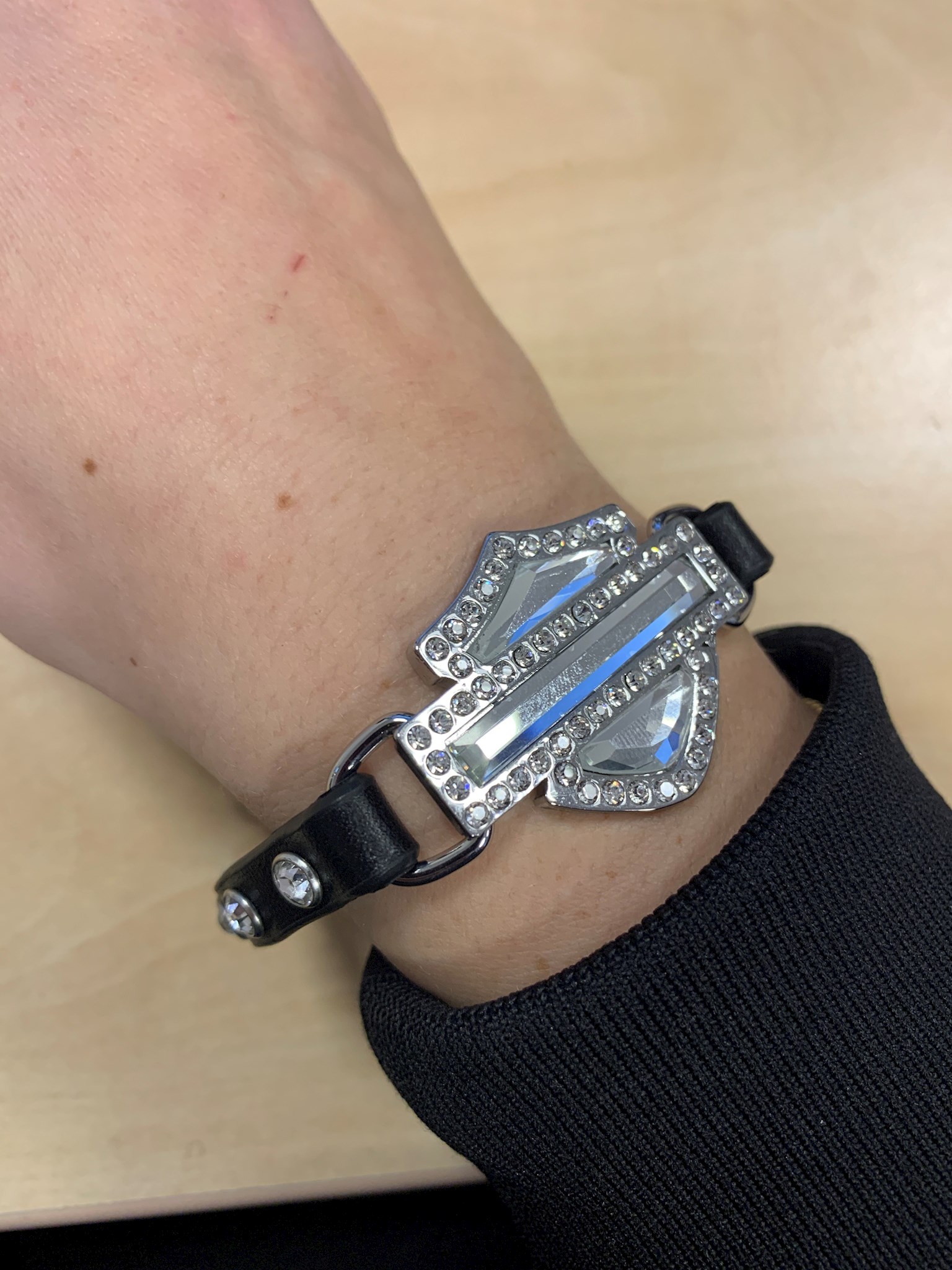 Harley-Davidson® Women's Diamond Eyes Cuff, HDWCU11231-BLK. Made from high-quality black Genuine leather with a smooth texture. Gorgeous rhinestone embellished Bar & Shield logo with rhinestone studded detailing around strap. Complete with polished nickel finish. Adjustable back closure for a custom fit. Total Length: 8.5". Perfect accessory to "Biker-Up" any outfit!
