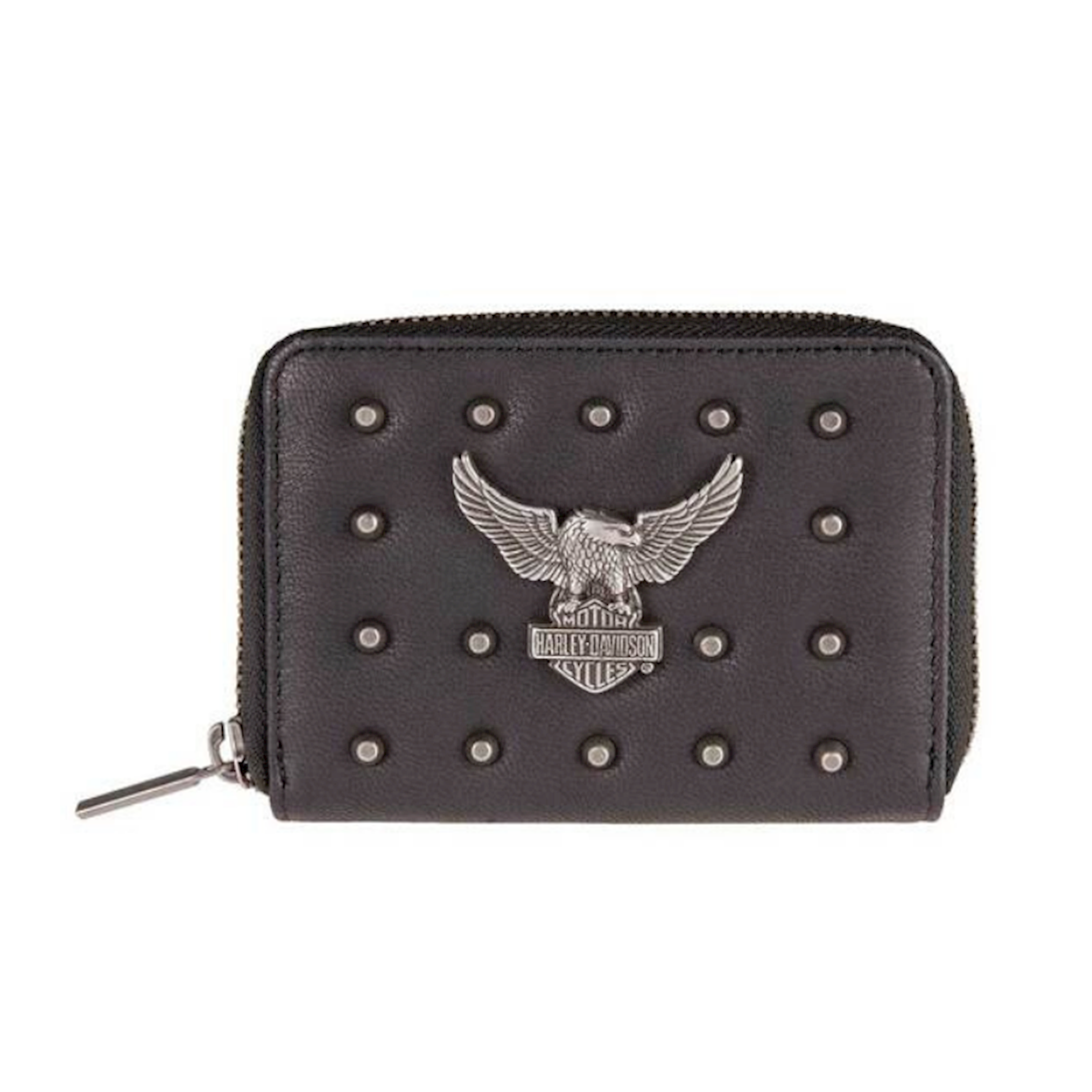 Harley-Davidson® Women's Nothing But Trouble Small Leather Wallet. Constructed from durable high-quality Genuine leather with a smooth texture. Decorated with an antique nickel finish studded design and an up-winged engraved eagle emblem. Interior includes: 3 credit card slots, 4 cash pockets and zippered coin pocket on back. Secure zip around wallet. Size: 5" x 3.5".