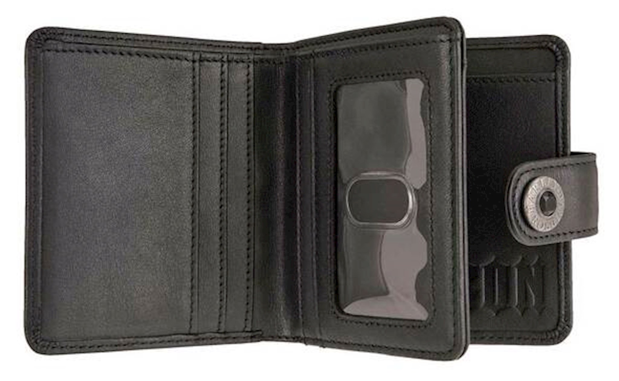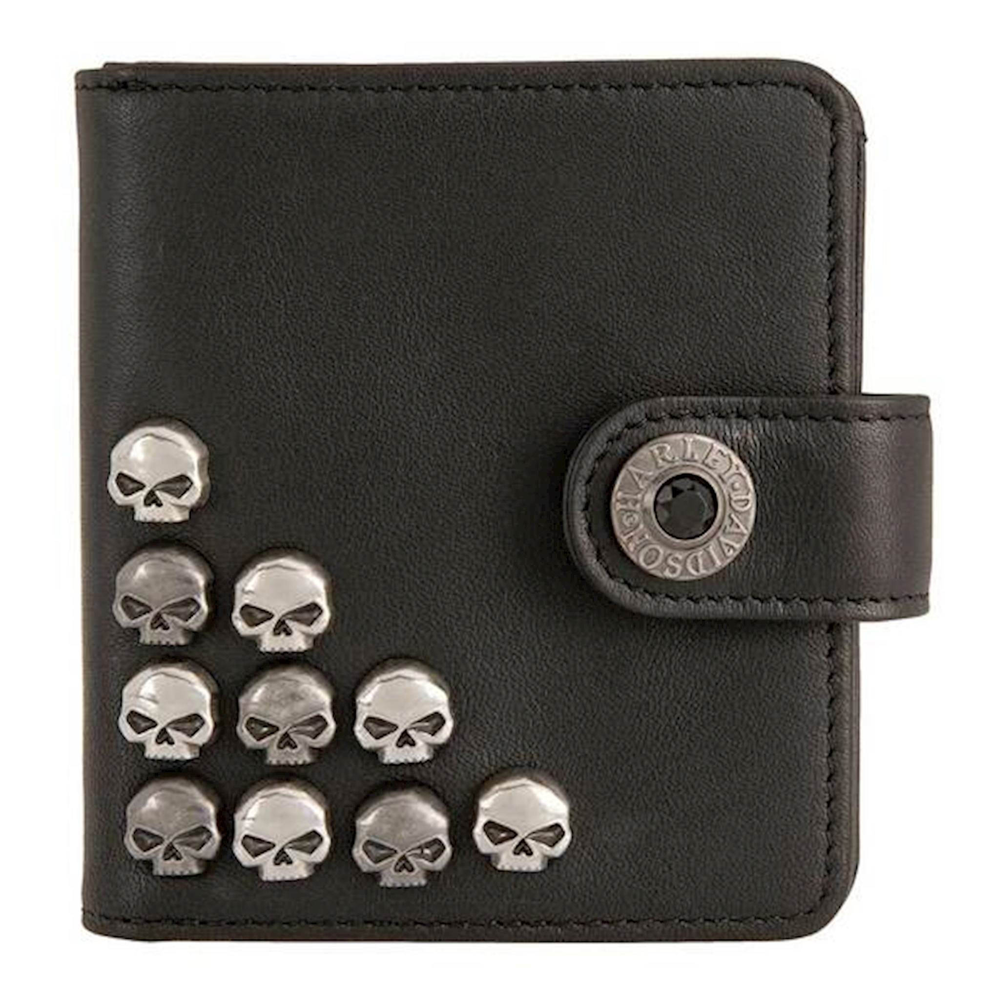 Harley-Davidson® Women's Willie Stacker Studded Leather Wallet, HDWWA11289-BLK. Constructed from high-quality Genuine black leather. Decorated with metal skull emblems, a Harley-Davidson® script metal snap, and script embossment inside. Interior features two layers, with four compartments. Interior includes: 3 credit card slots, an ID window, two cash slots, with a zippered coin pouch on back exterior. Size: 3.5" L x 4" H.