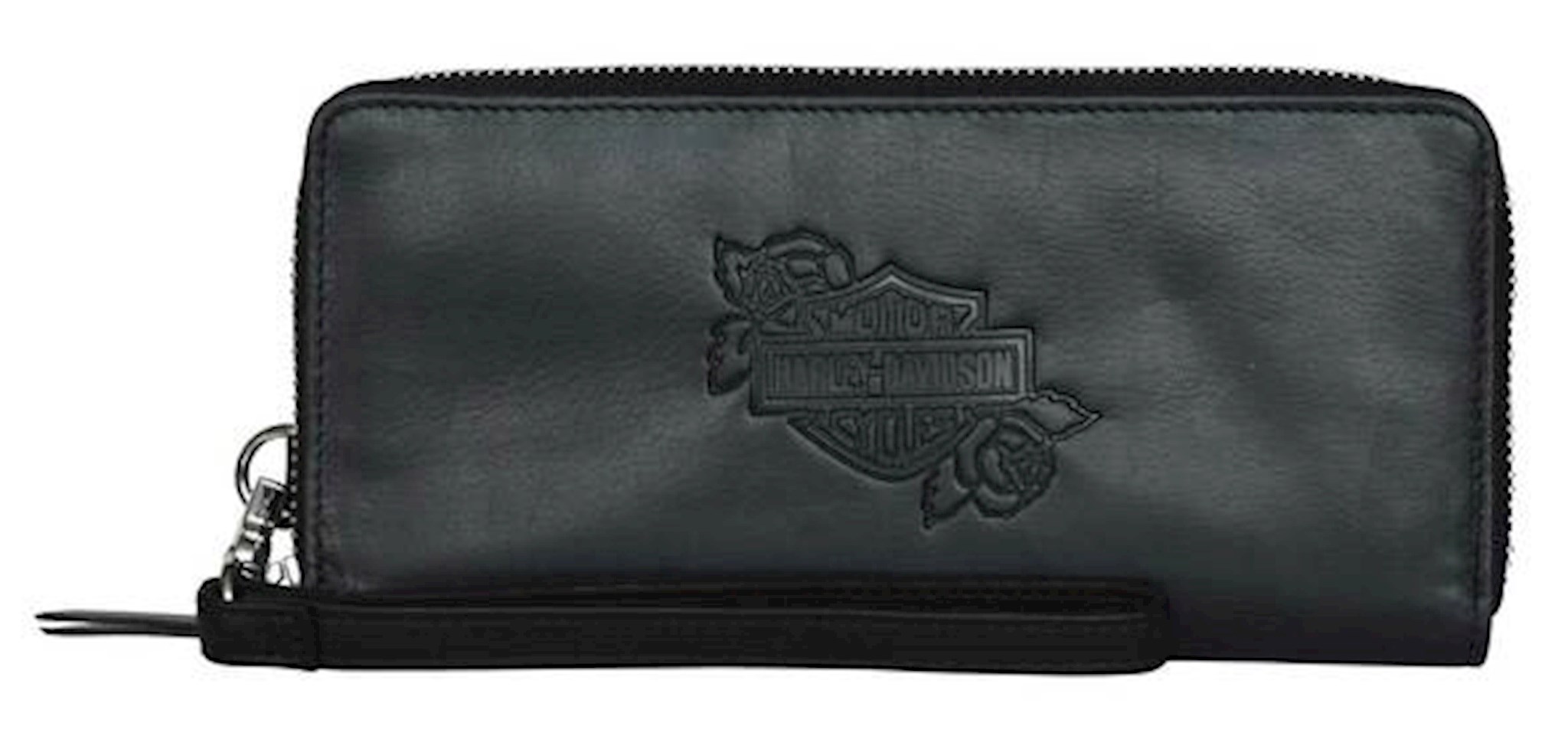 Harley-Davidson® Women's Rockin' Roses Large Zip Around Wallet - Black, HDWWA11764-BLK. Constructed from high-quality Genuine black leather. Absolutely adorable embossed Bar & Shield and roses graphic. Polished nickel finish on zipper and detachable wristlet. Interior features: 9 credit card slots, ID window, 2 large slip pockets and gusset pocket. RFID Protection, blocks hackers from reading your information. Size: 7.75" x 3.75".