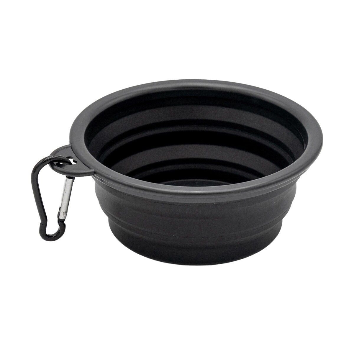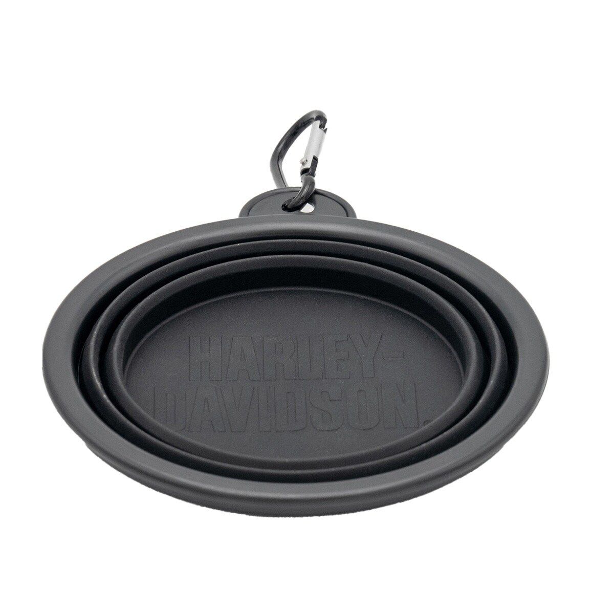 Collapsible food grade silicone bowl with embossed Harley-Davidson logo. Includes metal carabiner clip for easy transport. Dimensions: 5" diameter x 2" H / 13 x 6 cm.