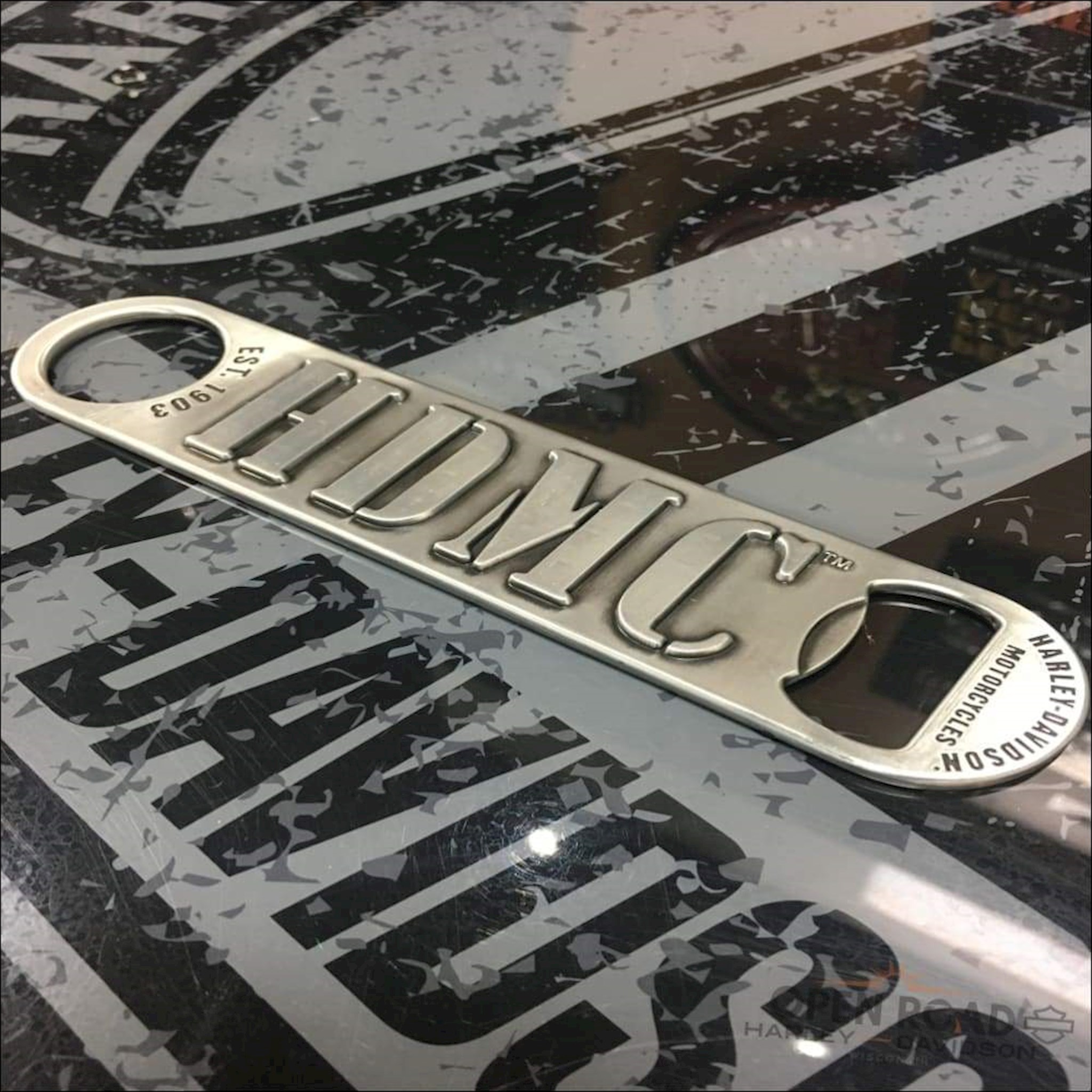 This custom-tooled metal bottle opener will be a necessity in your home. This big design fits well in your whole hand. The raised, stencil-lettered HDMC® across the middle gives you the grip you need to crack open a cold one in style.