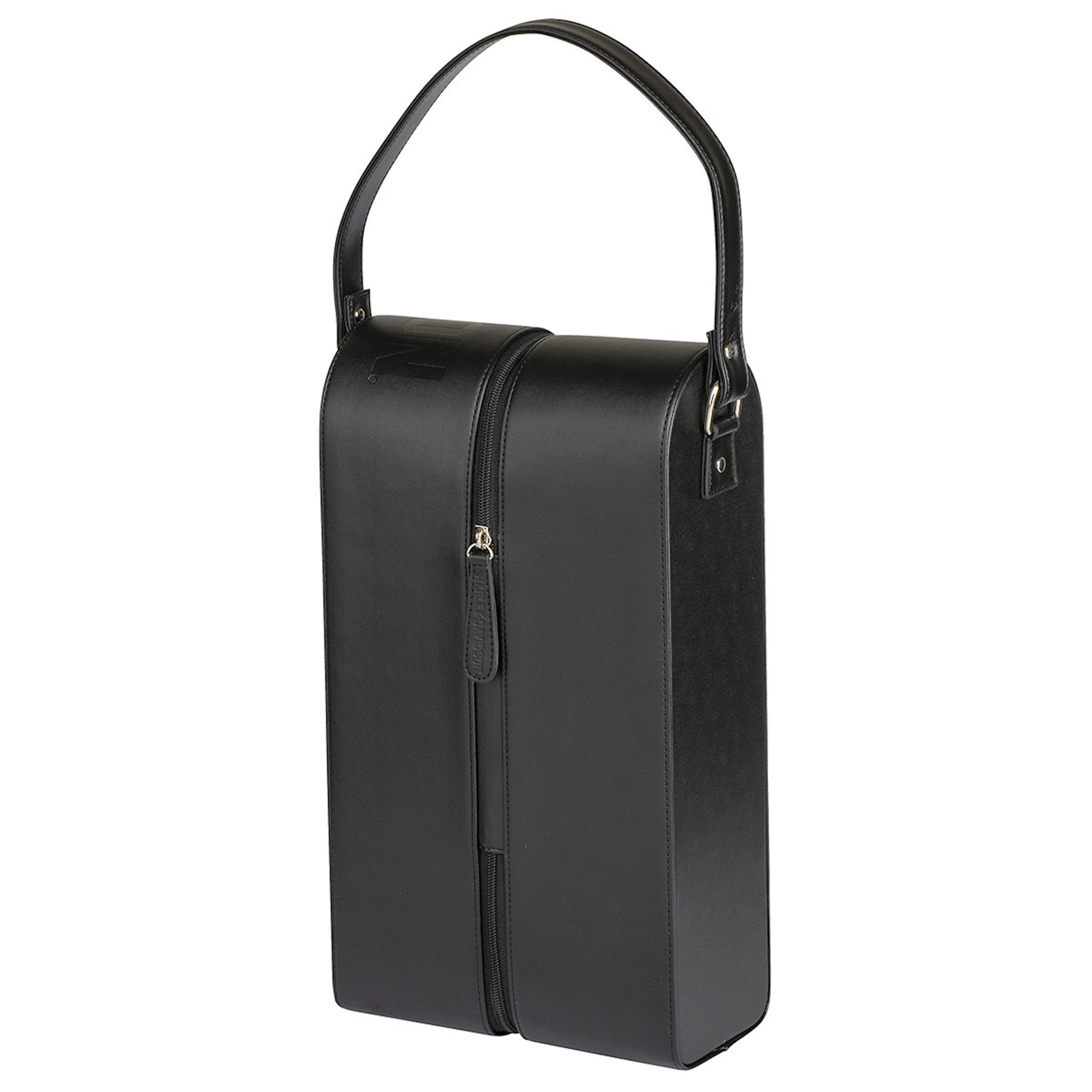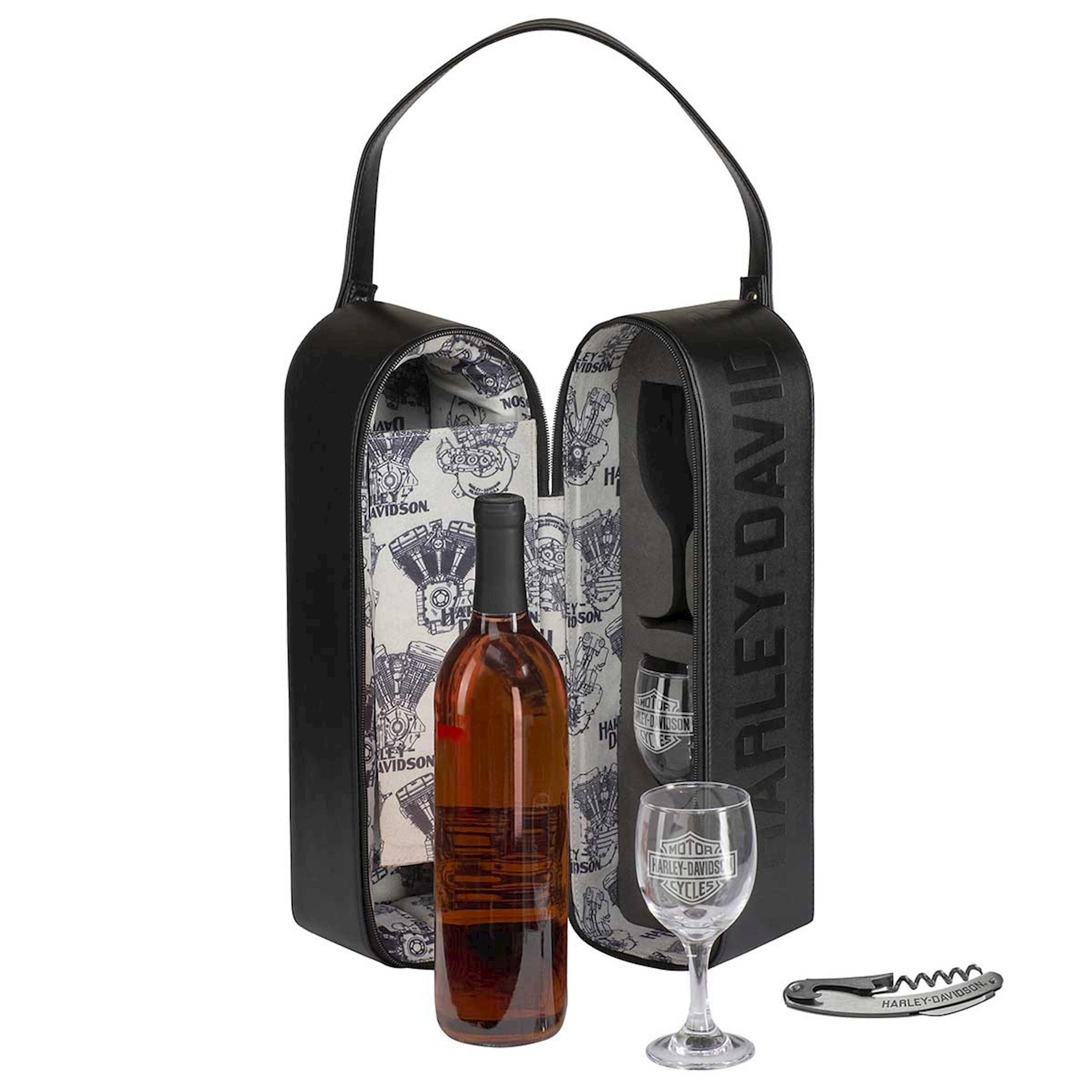 Durable hard-sided wine bottle case includes two 5 oz. / 150 ml Bar & Shield wine glasses and one corkscrew bottle opener. Embossed Harley-Davidson logo on side of case. Repeat engine pattern on inside. Dimensions: 5" W x 14.5" H x 8" D / 13 x 37 x 21 cm.