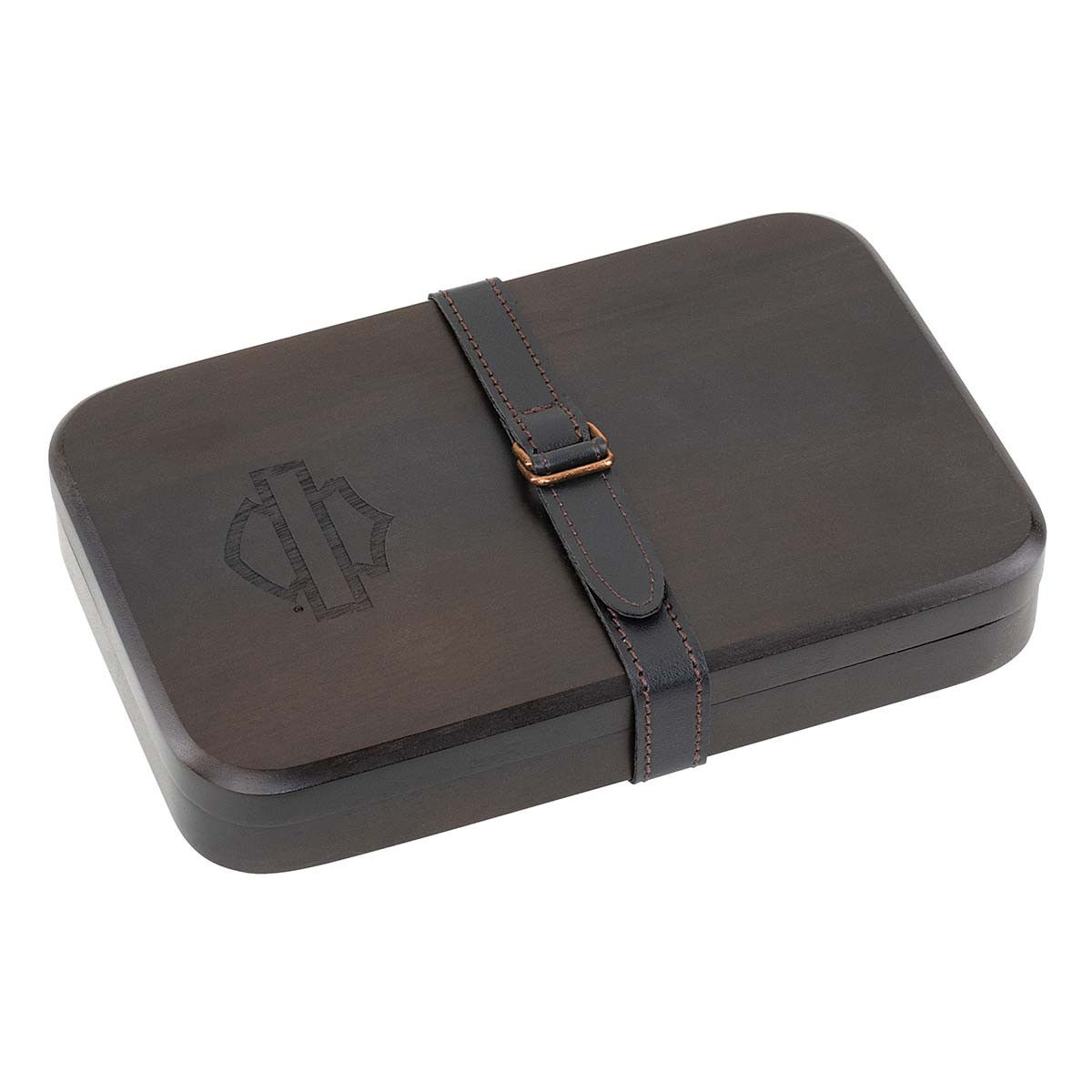 Two-piece, black acacia wood cutting board with debossed Open Bar & Shield logo. Set includes cheese knife with engraved Harley-Davidson logo on the handle. Leather band holds boards together when not in use. Hand wash only. Dimensions: 10" L x 2.5" H x 6.5" D / 25 x 6 x 17 cm.