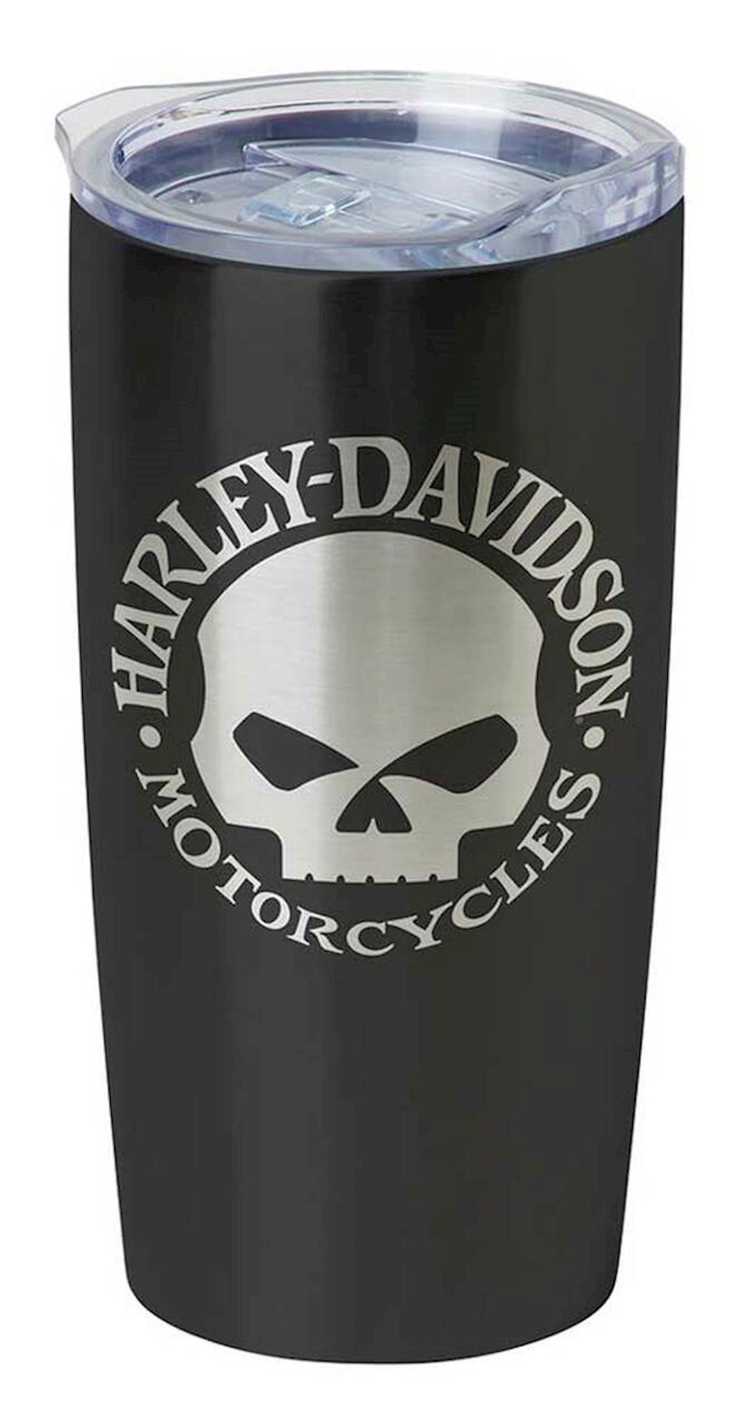 Harley-Davidson® Core Willie G Skull Travel Mug, HDX-98618. Size: 20 oz. Insulated stainless steel travel mug with semi-matte black finish. Laser engraved Willie G Skull logo on both sides. Hand wash only. Do not microwave.