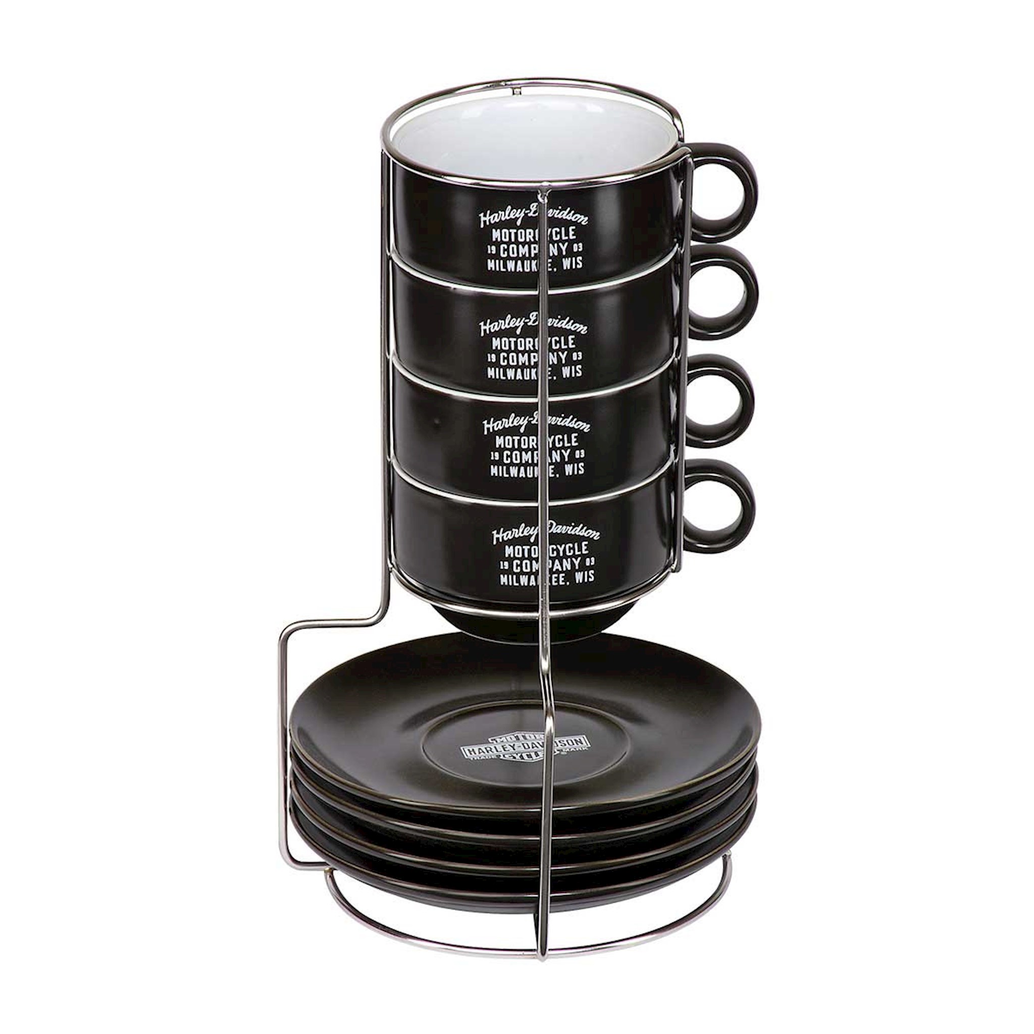 Set of four 4 oz. / 120 ml black ceramic espresso mugs with saucers and wire holding rack. Mugs feature H-D Motor Company graphic on front and 1903 on inside. Saucers feature Trademark Bar & Shield logo. Dishwasher and microwave safe.