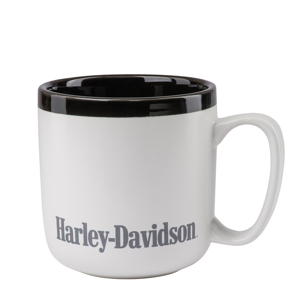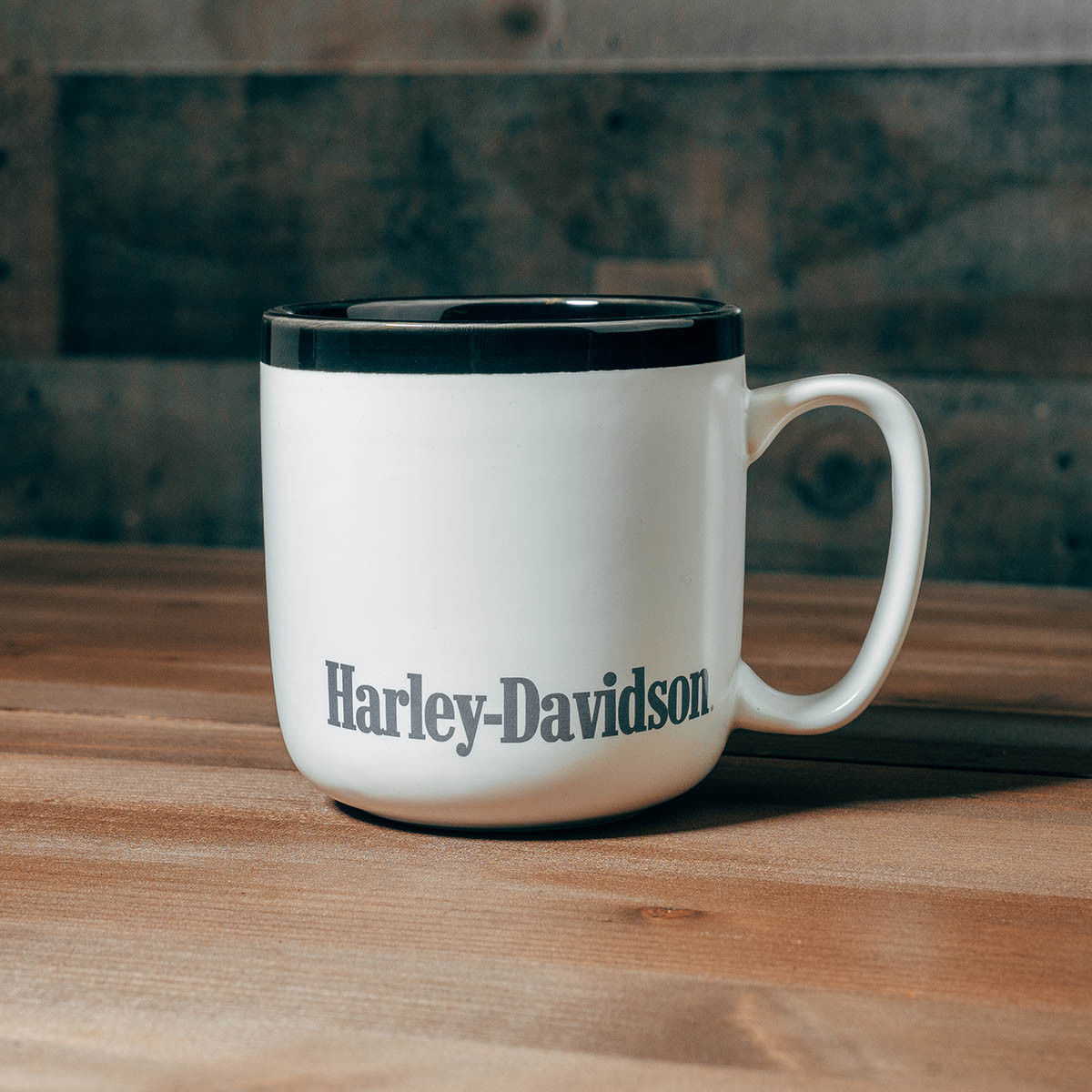 16 oz. / 480 ml white ceramic mug with gloss black interior and rim. Grey Harley-Davidson logo along the base. Dishwasher and microwave safe.