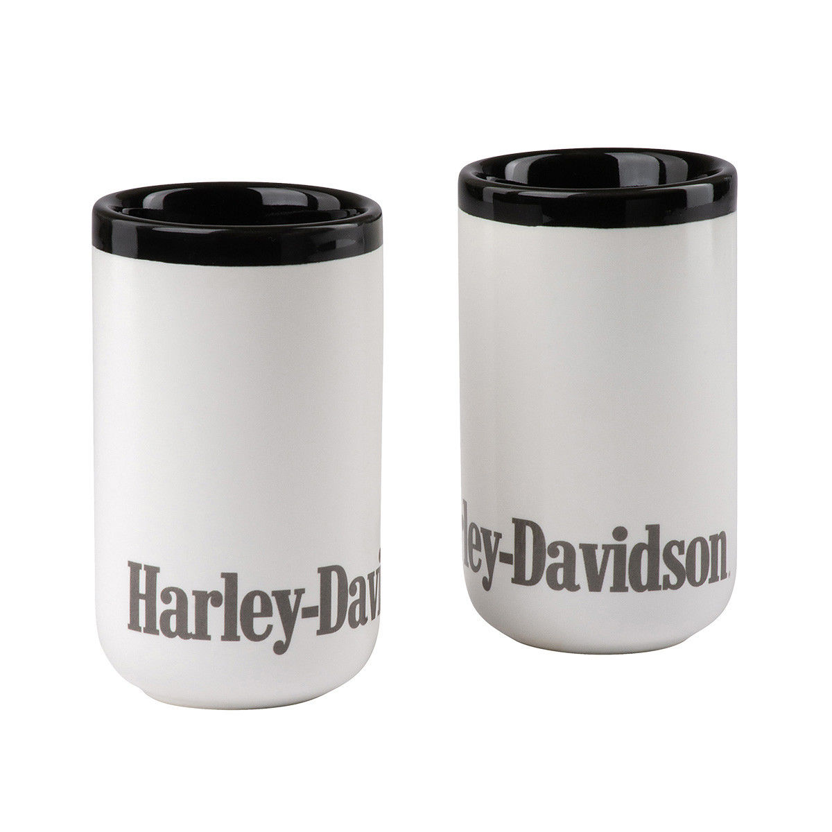 Set of two 3 oz / 90 ml ceramic shooters with white exterior and gloss black interior/rim. Grey Harley-Davidson font along the base. Dishwasher and microwave safe.