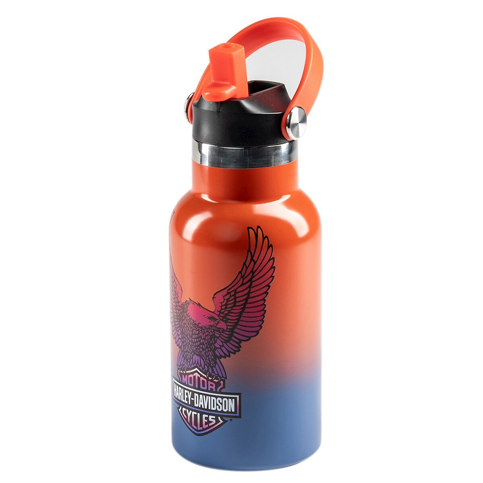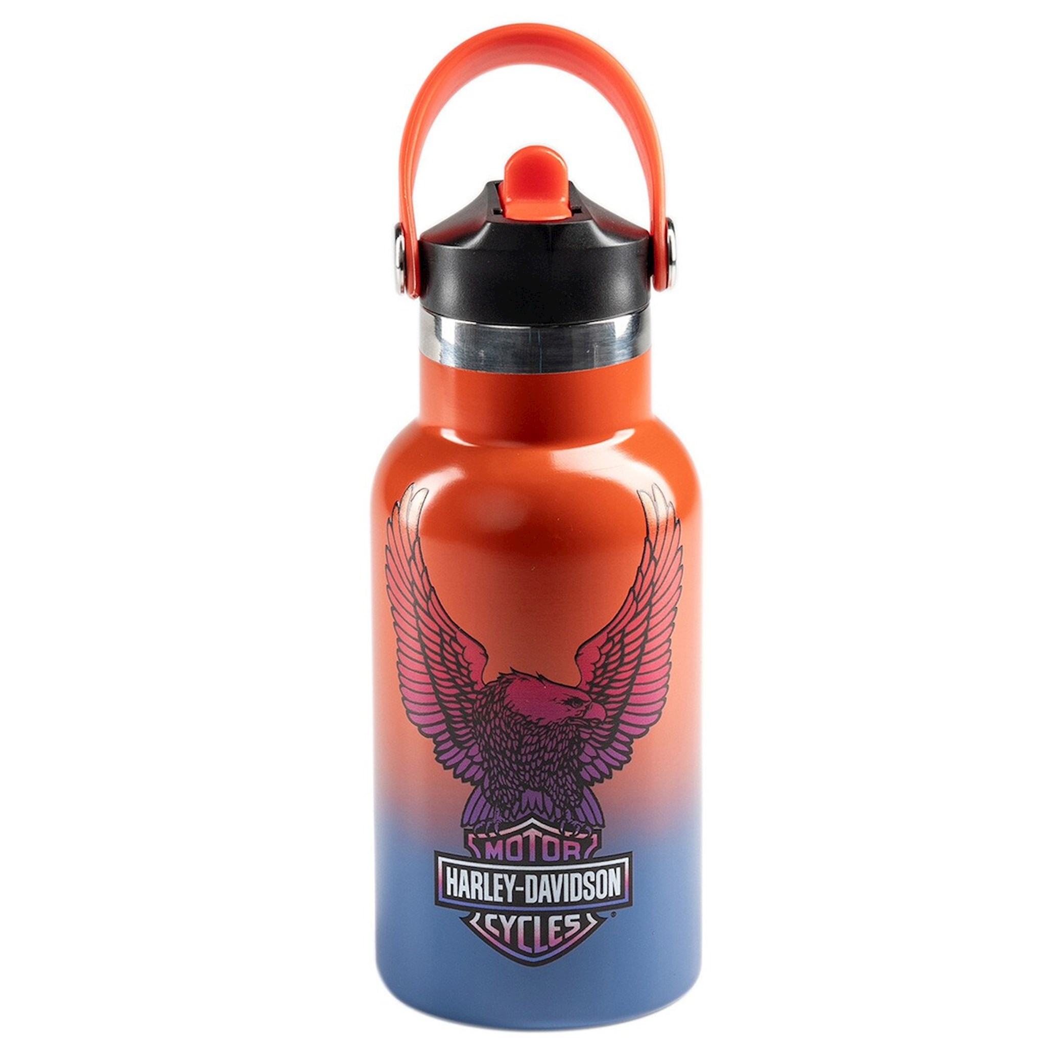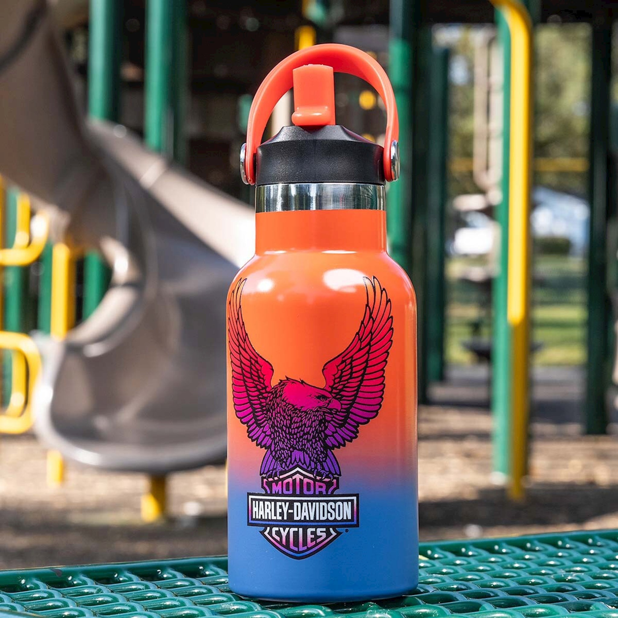 12 oz. / 360 ml stainless steel travel mug with plastic lid, handle, and leak-resistant straw. Bright colored ombre body with Vivid Bar & Shield Eagle graphic. Hand wash only. Do not microwave.