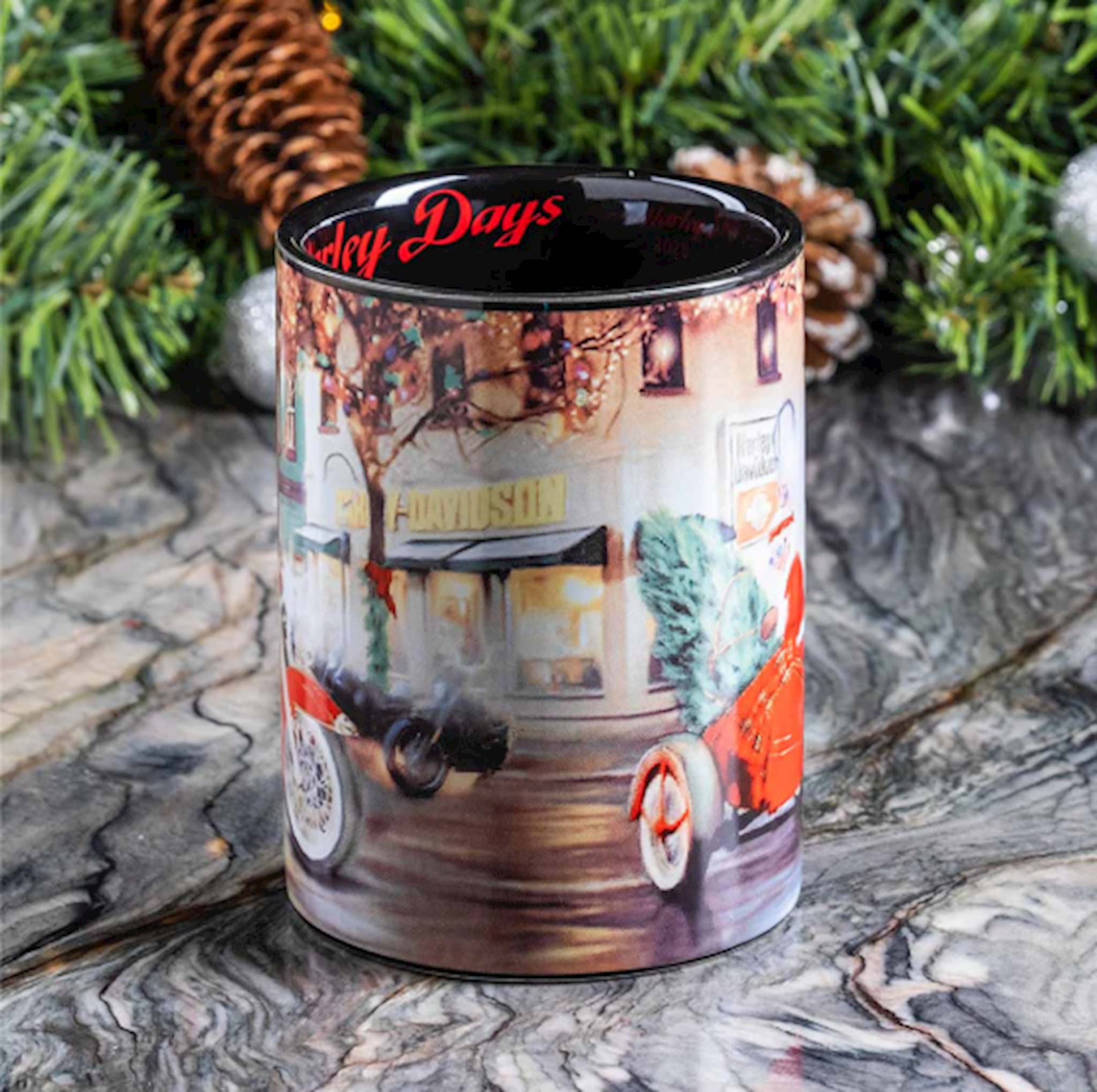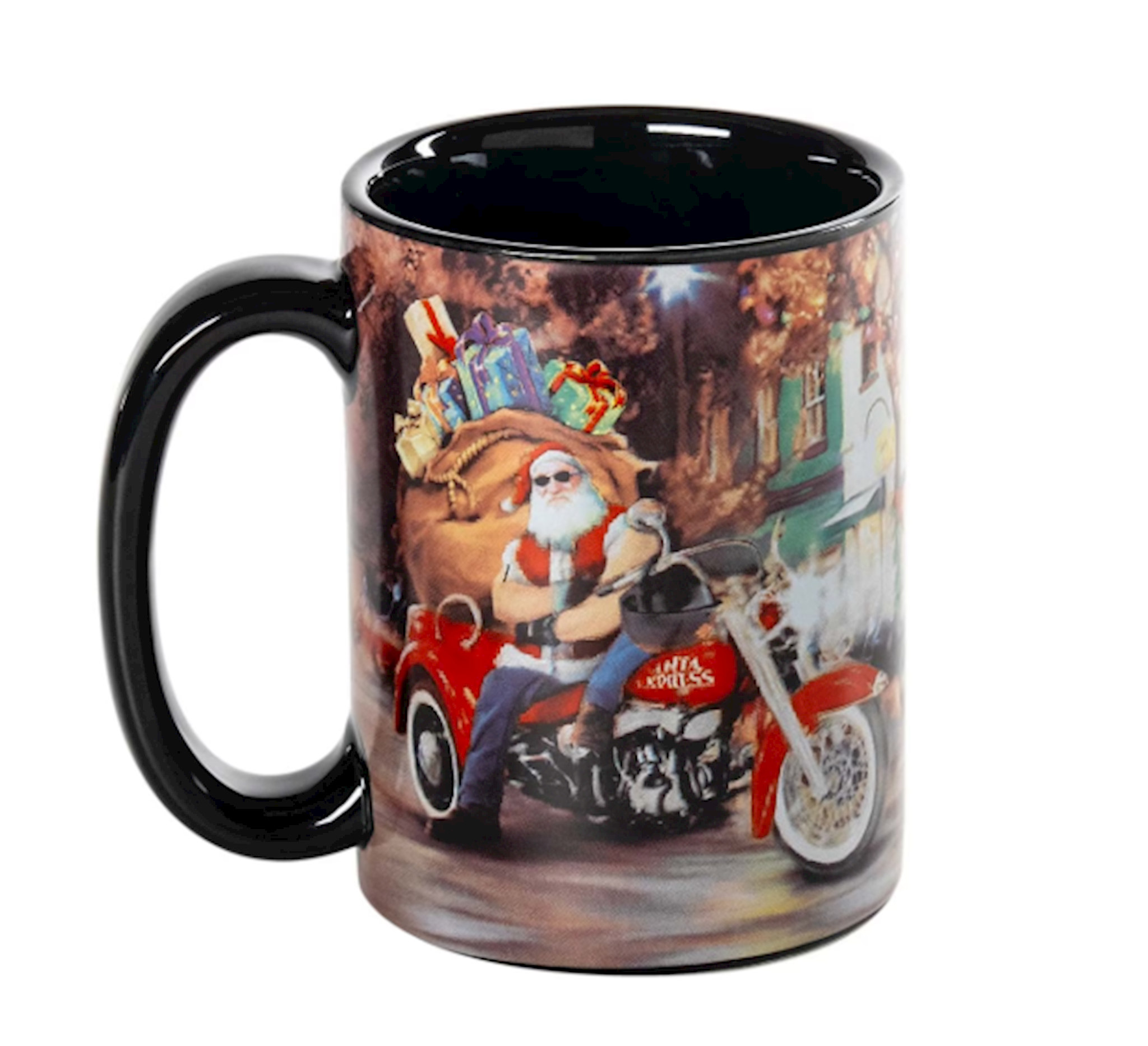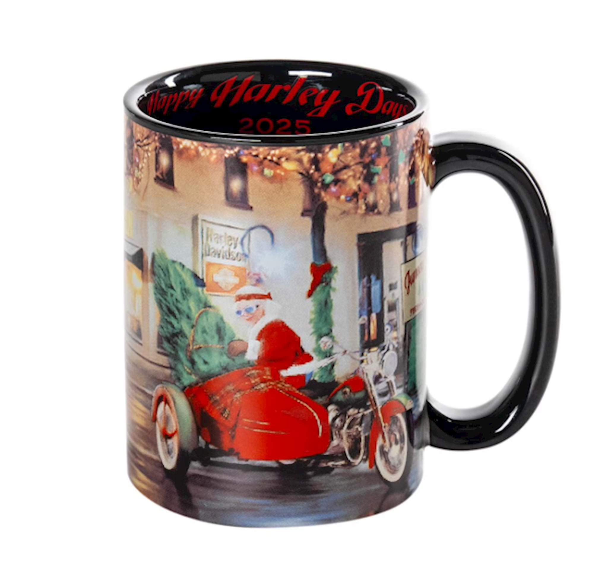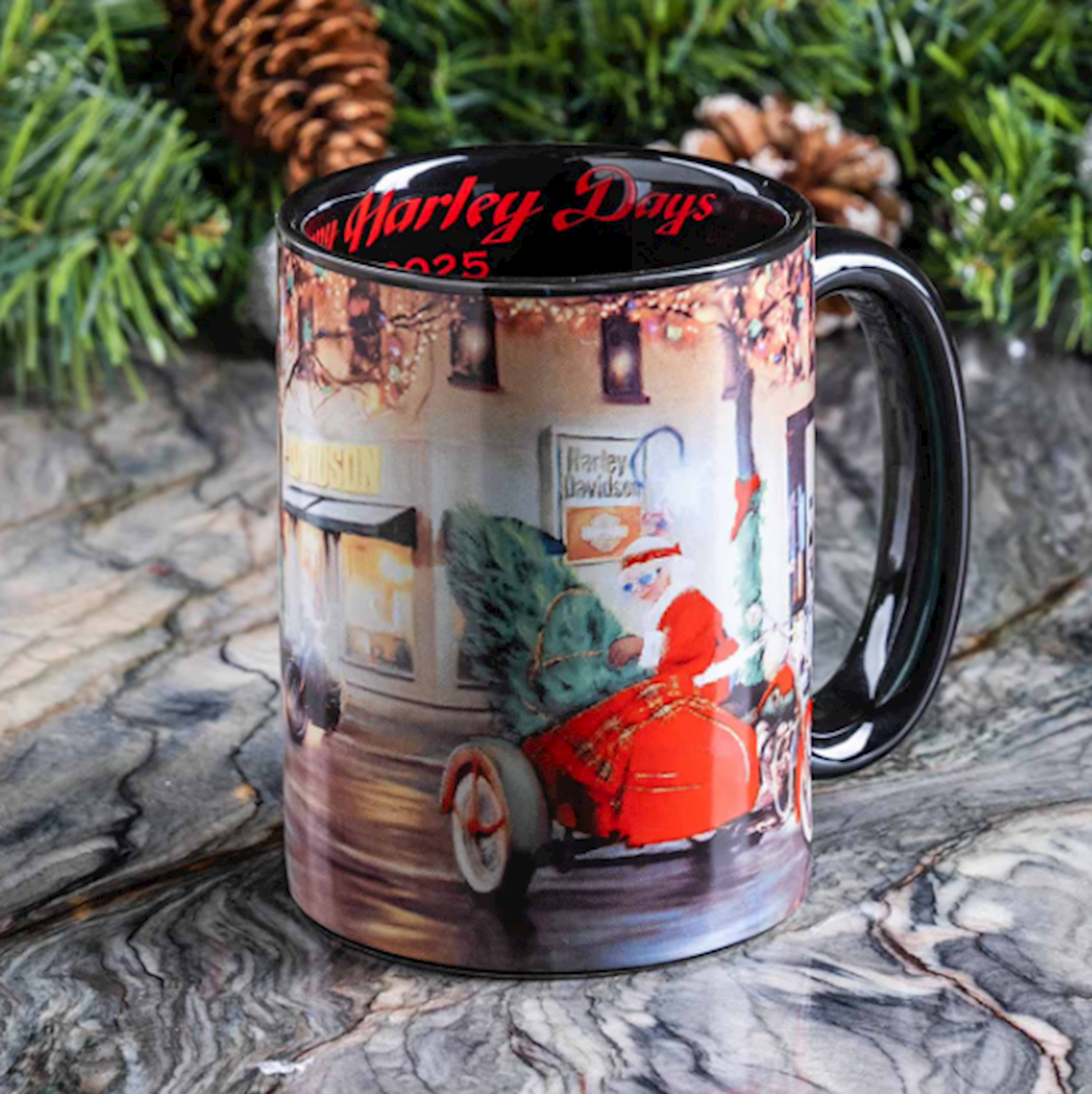 15 oz. / 450 ml black ceramic mug with full wrap Biker Santa scene and “Happy Harley Days 2025” on the inside rim. Dishwasher and microwave safe.