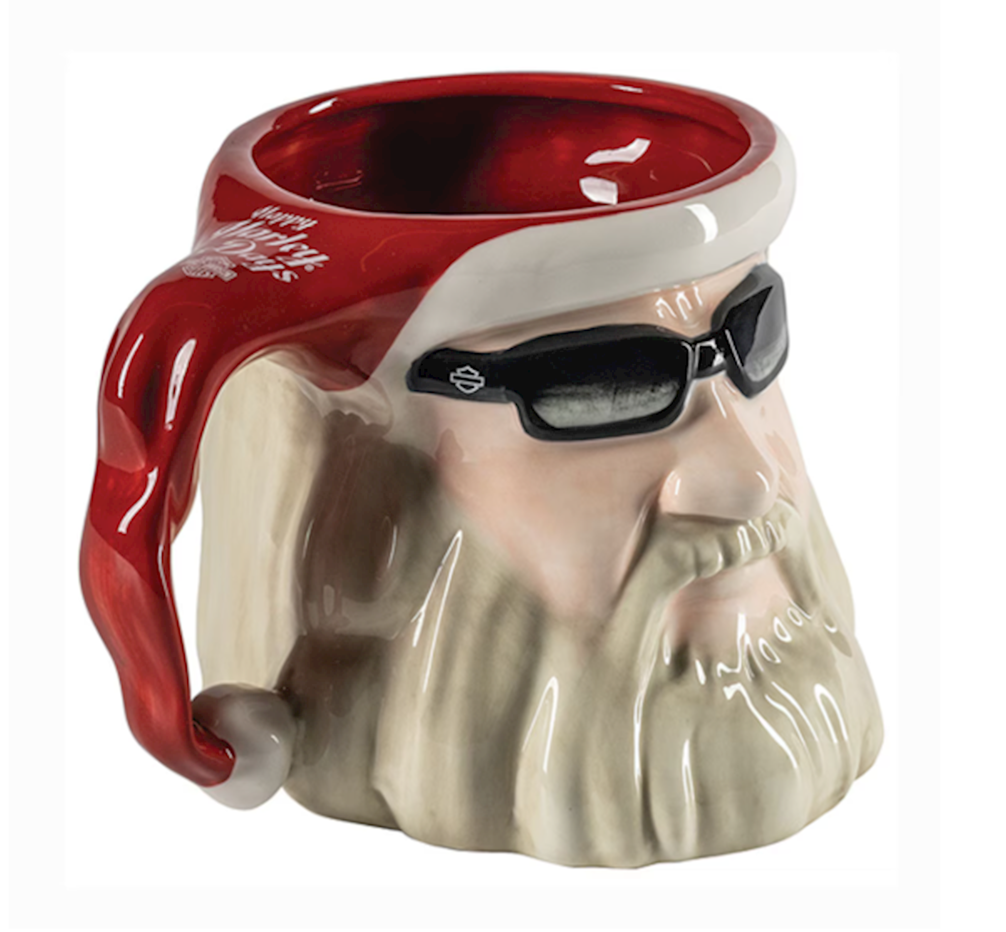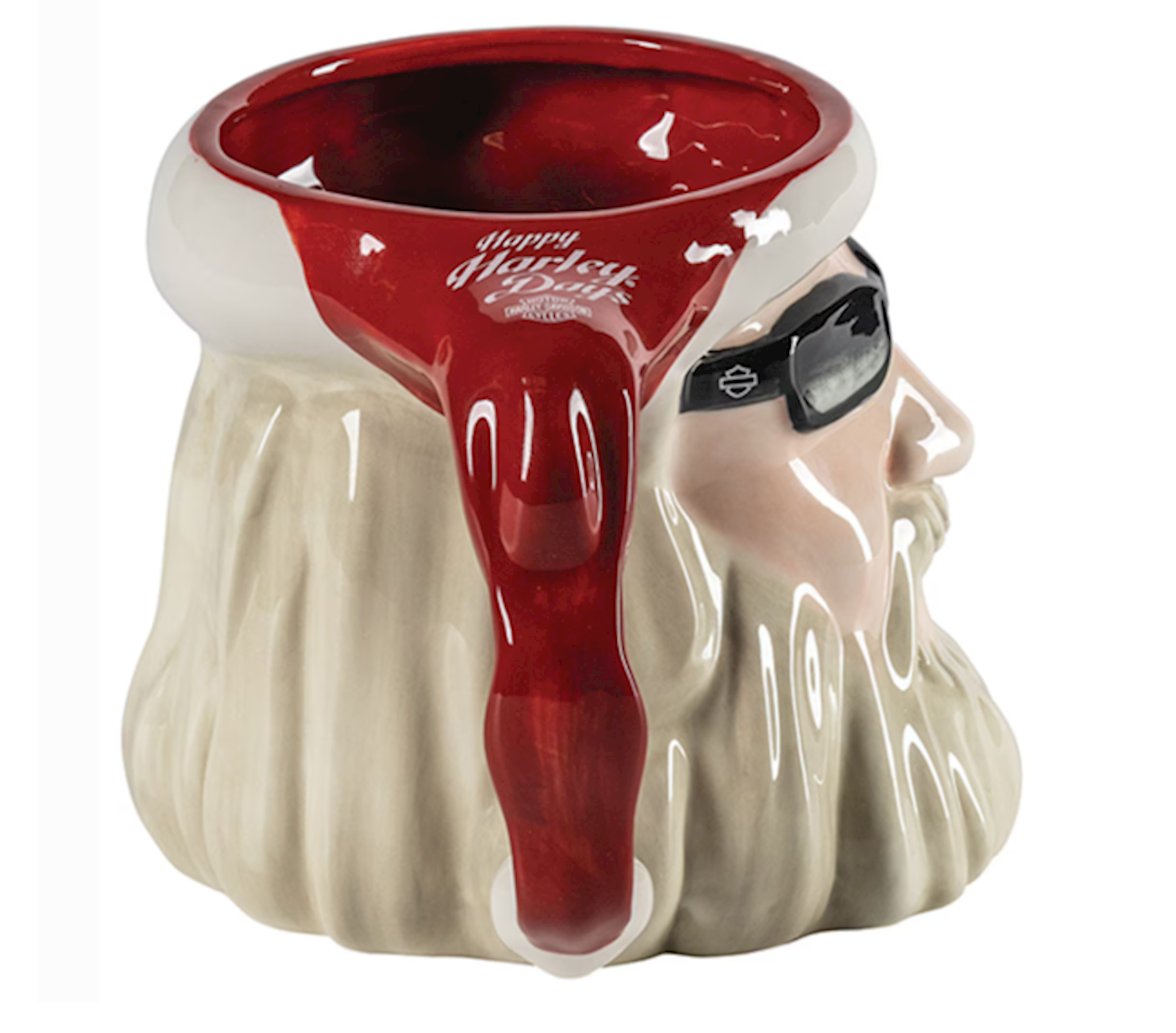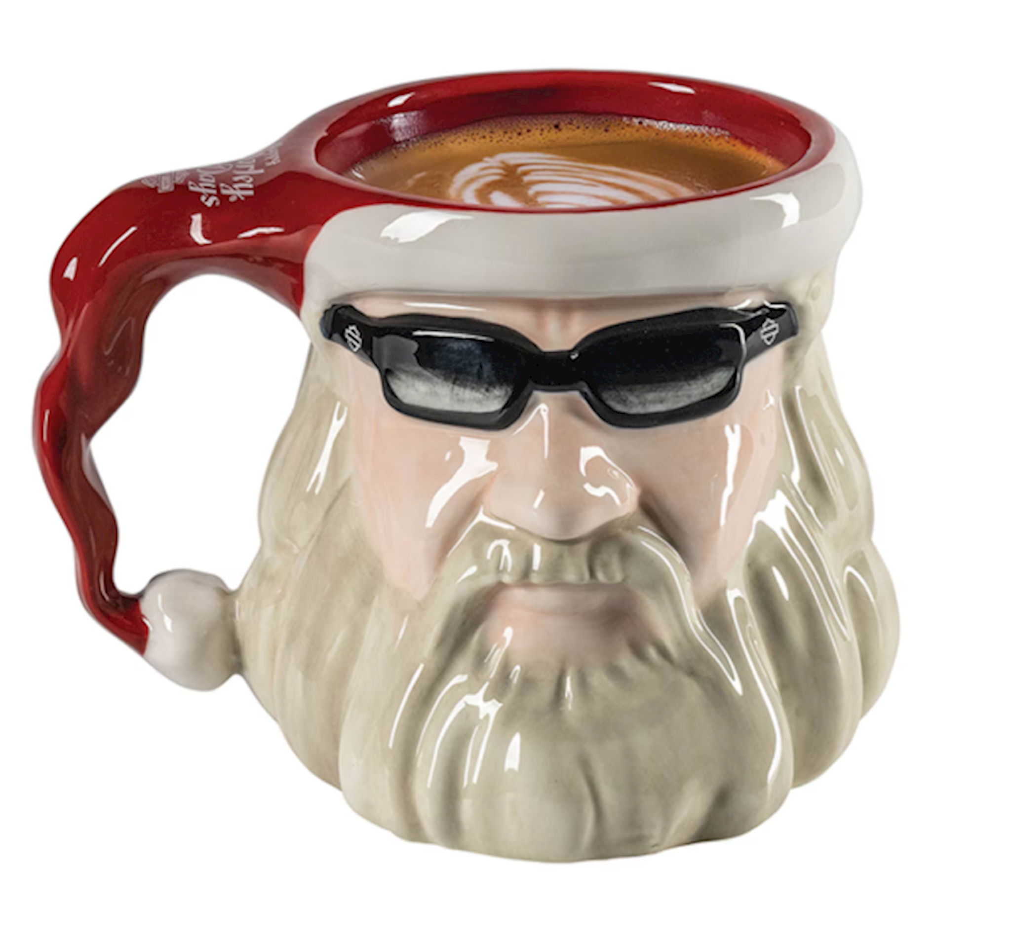 28 oz. / 840 ml custom sculpted Biker Santa mug. Happy Harley Days on hat. Hand wash only.