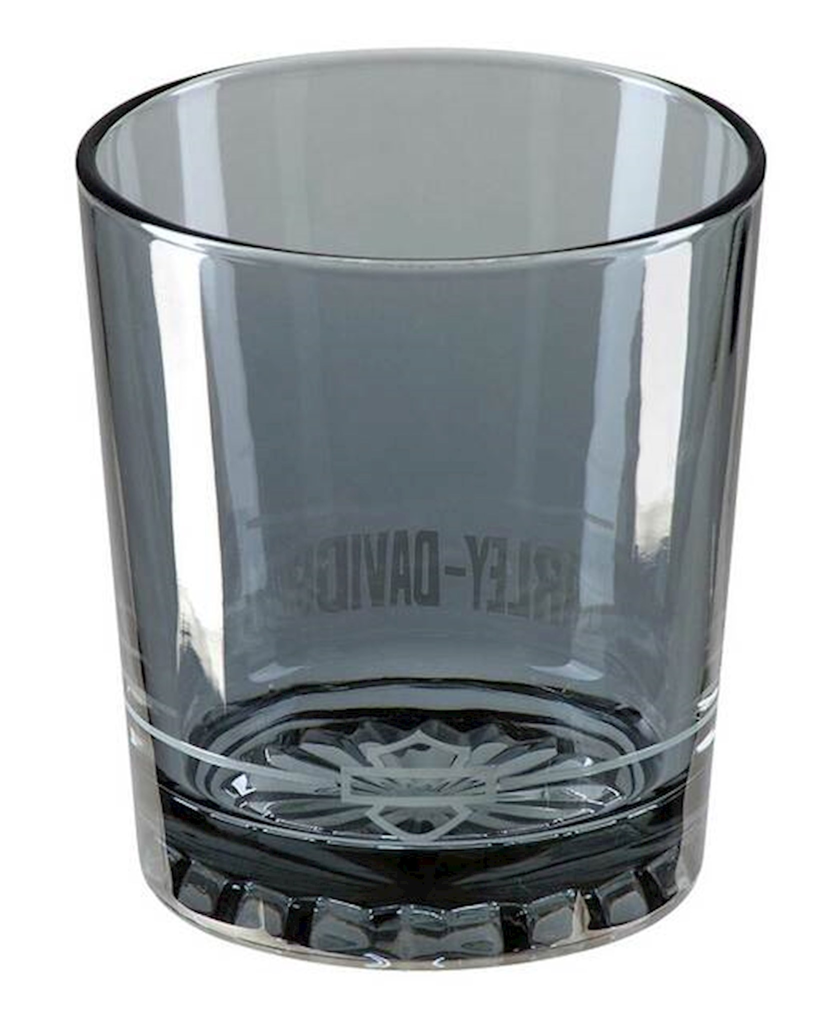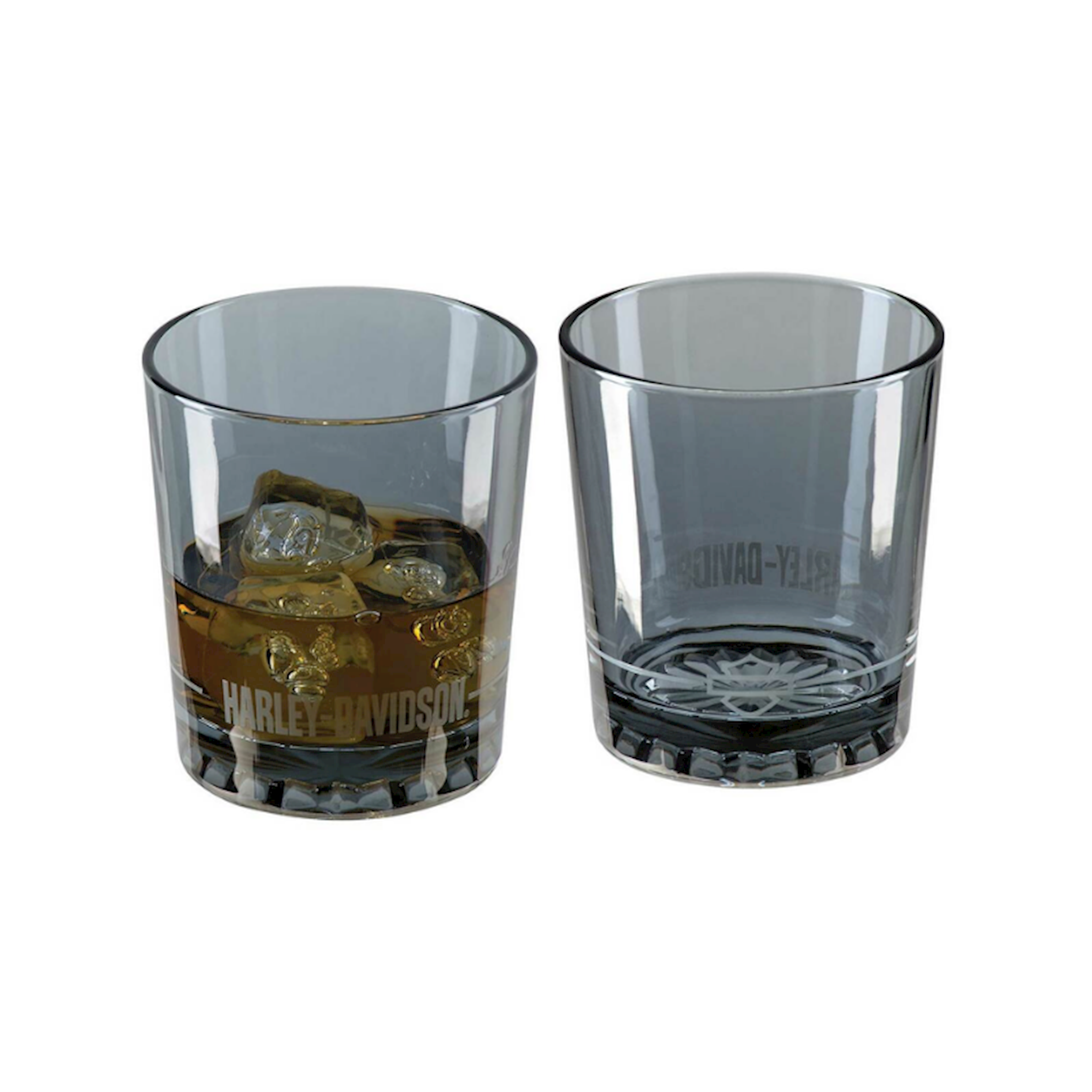 Harley-Davidson® Frosted Bar & Shield Double Old Fashioned Set, HDX-98725. Set of two classic 12 oz. double old fashioned glasses. Electroplated smoke gray finish. Frosted Harley-Davidson® and Silhouette Bar & Shield logos. Hand wash only. The perfect addition to your home bar!